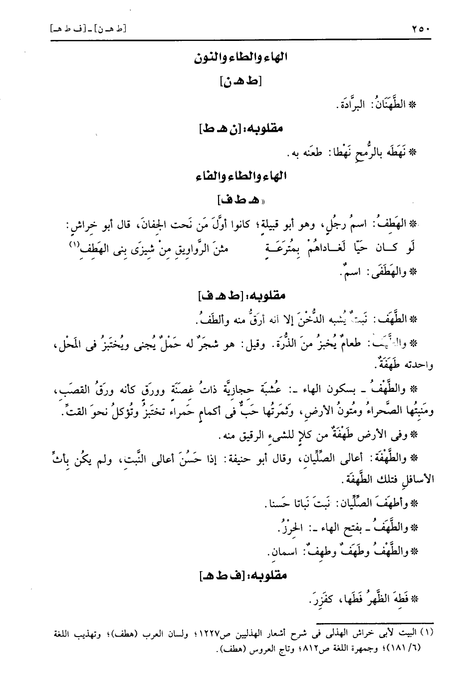 والطَّهْفَة: أعالي الصليان، وَقَالَ أَبُو حنيفَة: إِذا حسن أعالي النبت، وَلم يكن بأث الأسافل فَتلك الطَّهفَة.
