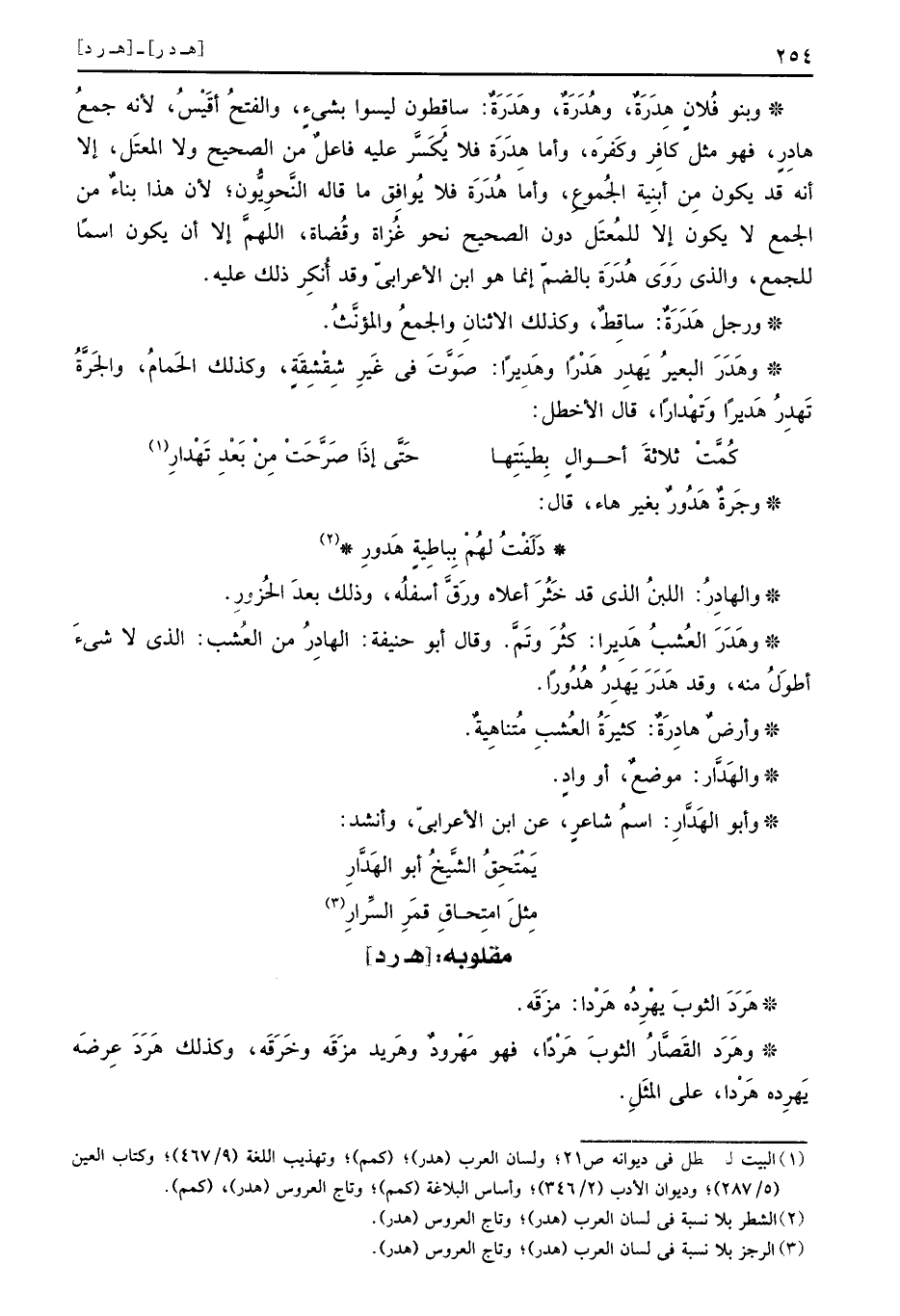 وَبَنُو فلَان هِدَرَةٌ، وهُدَرَةٌ، وهَدَرَةٌ: ساقطون لَيْسُوا بِشَيْء، وَالْفَتْح أَقيس، لِأَنَّهُ جمع هادر، فَهُوَ مثل كَافِر وكفره، وَأما هِدَرَة فَلَا يكسر عَلَيْهِ فَاعل من الصَّحِيح وَلَا المعتل، إِلَّا انه قد يكون من أبنية الجموع، وَأما هُدَرَة فَلَا يُوَافق مَا قَالَه النحويون، لِأَن هَذَا بِنَاء من الْجمع لَا يكون إِلَّا للمعتل دون الصَّحِيح نَحْو غزَاة وقضاة، اللَّهُمَّ إِلَّا أَن يكون اسْما للْجمع، وَالَّذِي روى هُدَرَة بِالضَّمِّ إِنَّمَا هُوَ ابْن الْأَعرَابِي وَقد أنكر ذَلِك عَلَيْهِ.