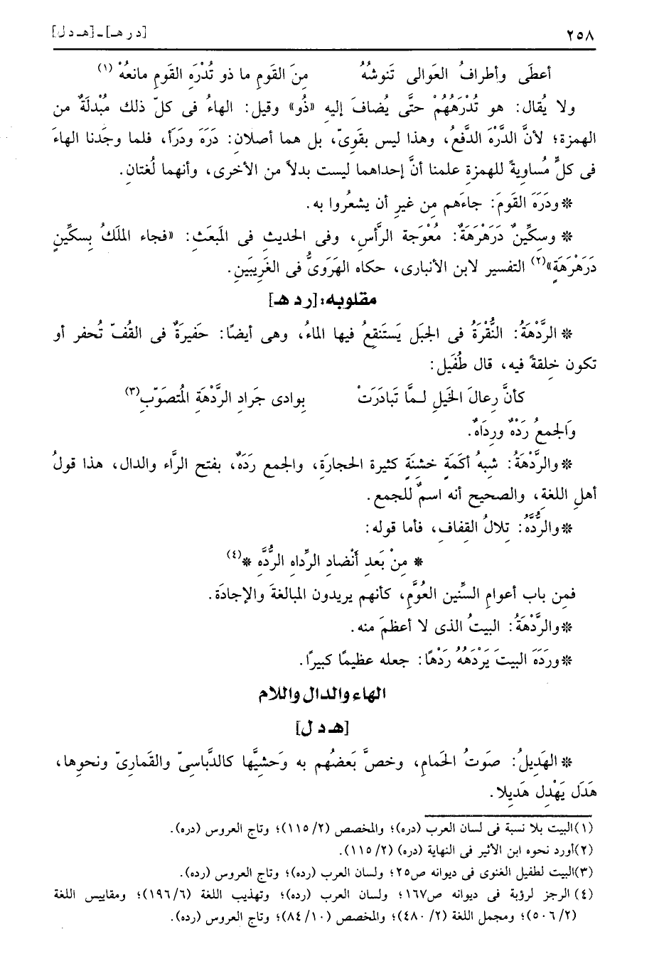 وَلَا يُقَال: هُوَ تُدْرَهُهُمْ حَتَّى يُضَاف إِلَيْهِ " ذُو " وَقيل: الْهَاء فِي كل ذَلِك مبدلة من الْهمزَة، لِأَن الدره الدّفع، وَهَذَا لَيْسَ بِقَوي، بل هما أصلان: دره وَدَرَأَ، فَلَمَّا وجدنَا الْهَاء فِي كل مُسَاوِيَة للهمزة علمنَا أَن إِحْدَاهمَا لَيست بَدَلا من الْأُخْرَى، وانهما لُغَتَانِ.