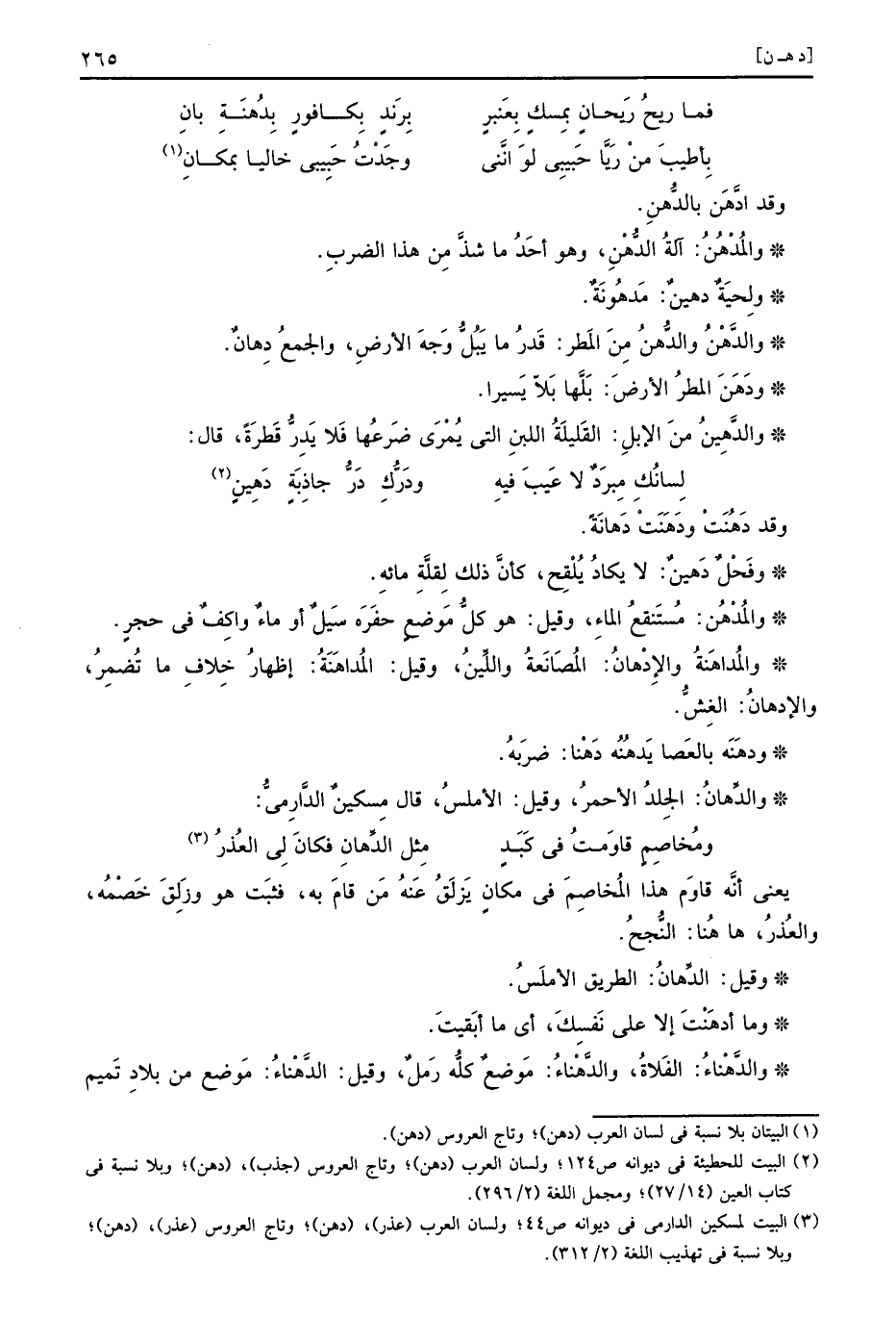 والدِّهانُ: الْجلد الْأَحْمَر، وَقيل: الأملس، قَالَ مِسْكين الدَّارمِيّ: