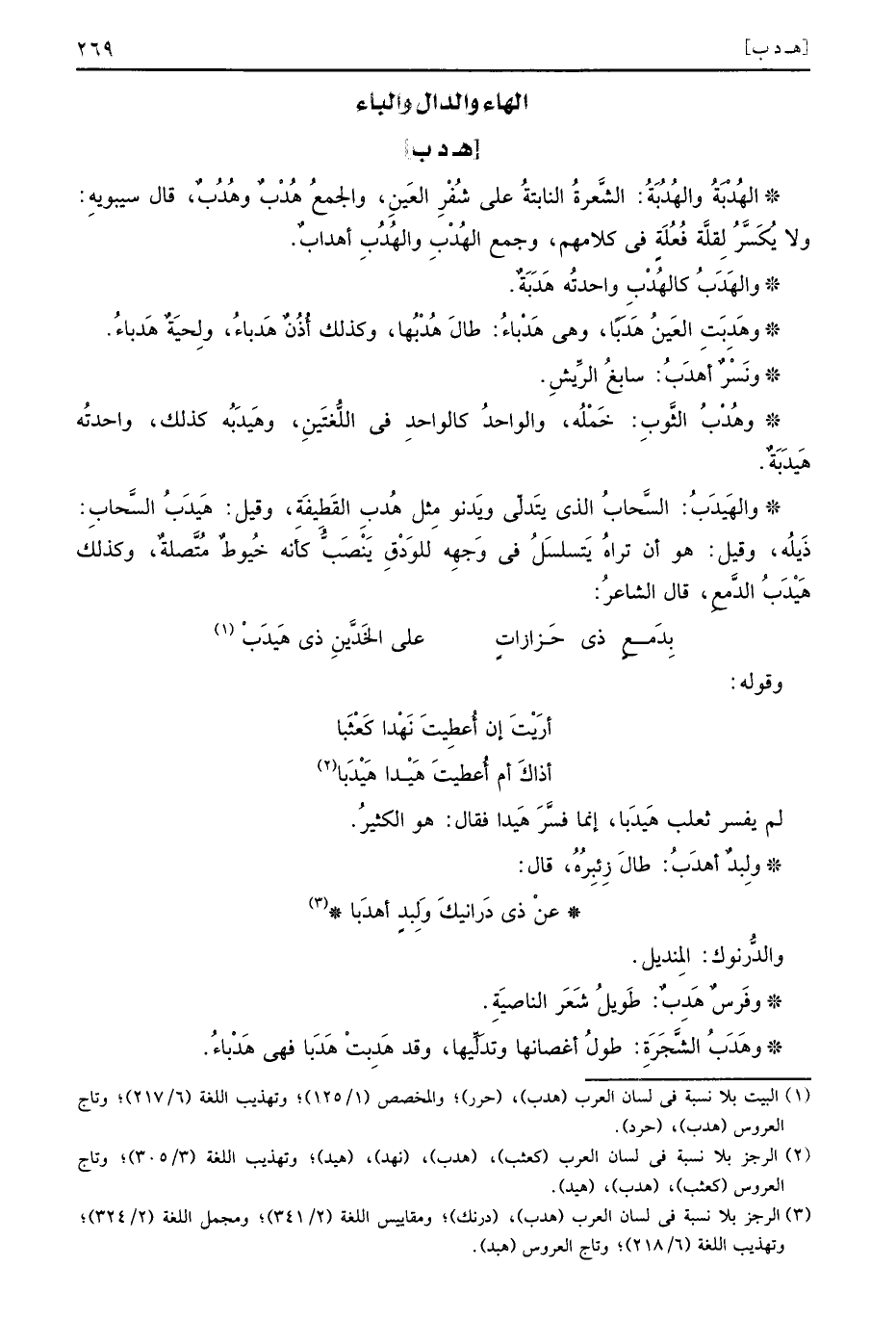 الهُدْبَةُ والهُدُبَةُ: الشعرة النابتة على شفر الْعين، وَالْجمع هُدْبٌ وهُدُبٌ، قَالَ سِيبَوَيْهٍ: وَلَا يكسر لقلَّة فعلة فِي كَلَامهم، وَجمع والهُدْبِ والهُدُبِ أهدابٌ.