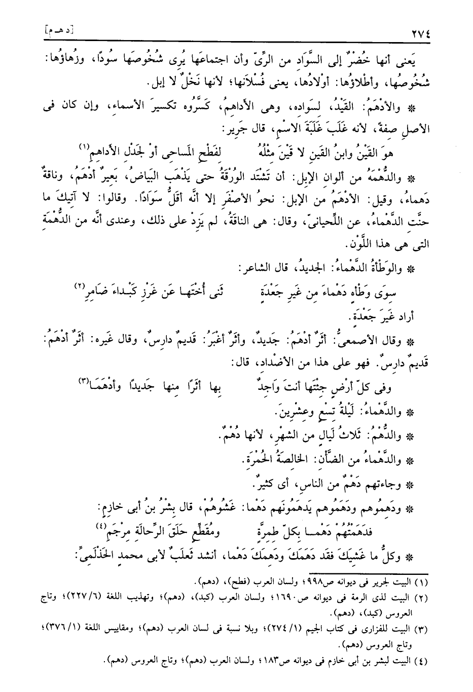 والأدْهَمُ: الْقَيْد، لسواده، وَهِي الأَداهِمُ، كسروه تكسير الْأَسْمَاء، وَإِن كَانَ فِي الأَصْل صفة، لِأَنَّهُ غلب غَلَبَة الِاسْم، قَالَ جرير: