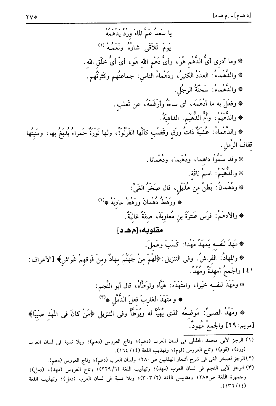 والمِهادُ: الْفراش. وَفِي التَّنْزِيل: (لهُمْ مِنْ جَهَنَّمَ مِهادٌ ومِنْ فَوقِهم غَواشٍ) وَالْجمع أمهِدَةٌ ومُهُدٌ.