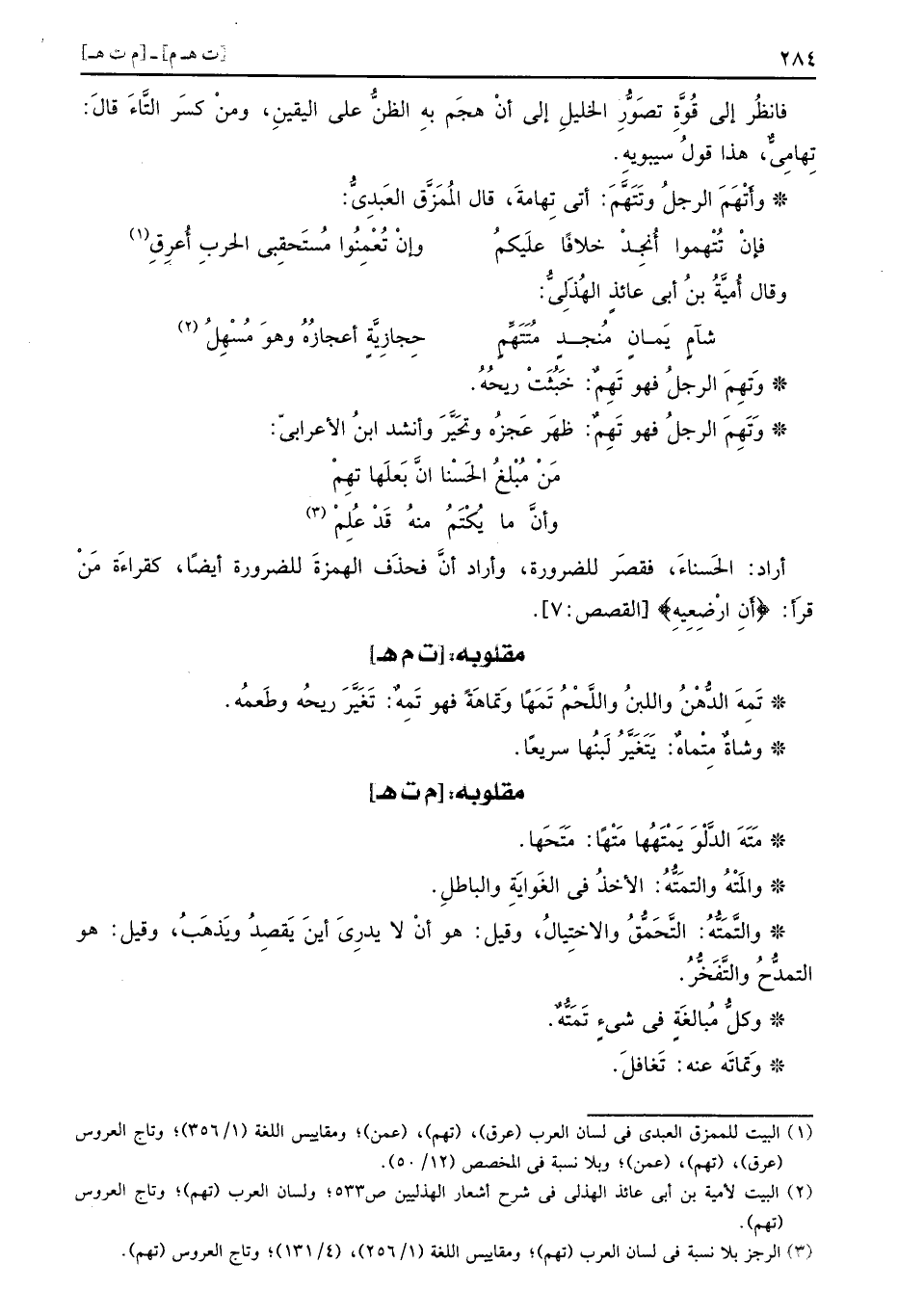وأْتهَمَ الرجل وتَتَهَّمَ: أَتَى تِهامةَ، قَالَ الممزق الْعَبْدي: