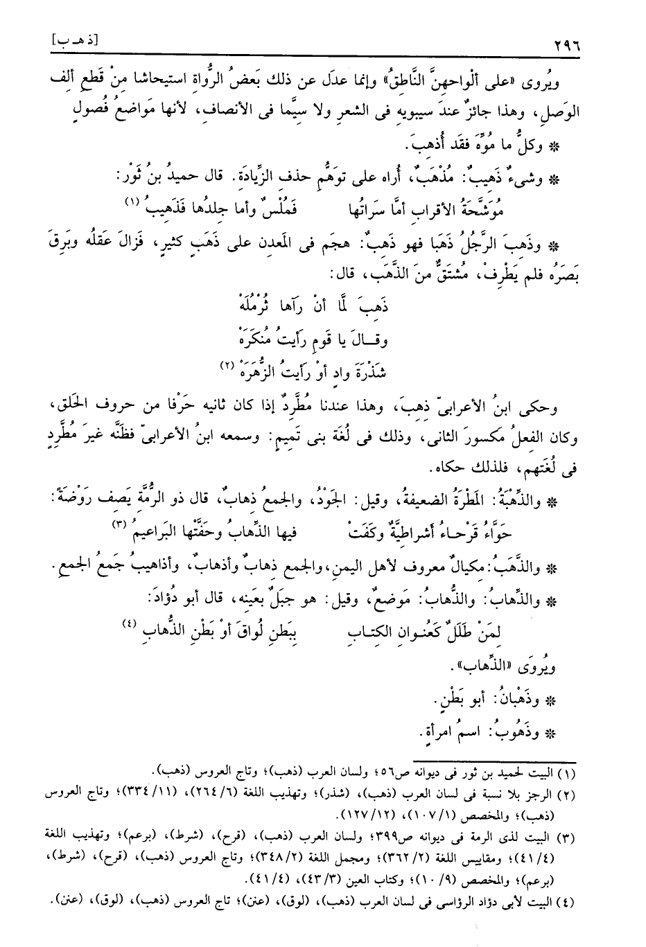 وَشَيْء ذَهِيبٌ: مُذْهَبٌ، أرَاهُ على توهم حذف الزِّيَادَة. قَالَ حميد بن ثَوْر: