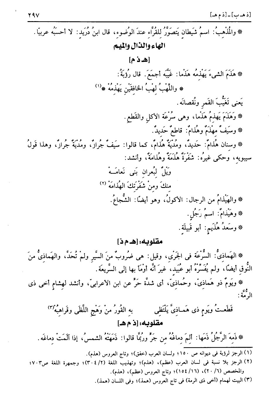 هَذَمَ الشَّيْء يَهْذِمُه هَذْما: غيَّبه أجمع، قَالَ رؤبة: