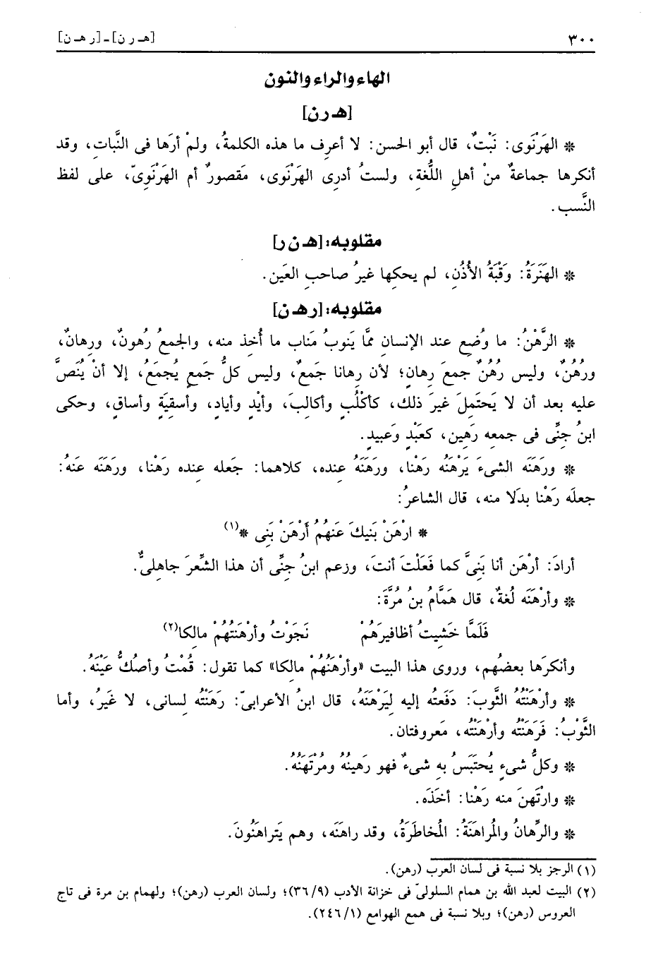 الهَرْنَوي: نبت، قَالَ أَبُو الْحسن: لَا أعرف مَا هَذِه الْكَلِمَة، وَلم أرها فِي النَّبَات، وَقد أنكرها جمَاعَة من أهل اللُّغَة، وَلست أَدْرِي الهَرْنَوي، مَقْصُور أم الهَرْنَوي، على لفظ النّسَب.
