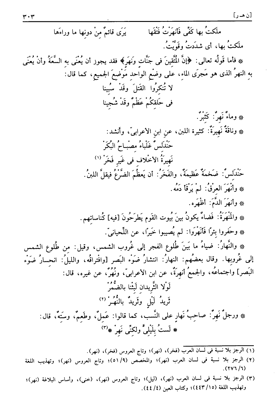 والنَّهارُ: ضِيَاء مَا بَين طُلُوع الْفجْر إِلَى غرُوب الشَّمْس، وَقيل: من طُلُوع الشَّمْس إِلَى غُرُوبهَا. وَقَالَ بَعضهم: النَّهَار: انتشار ضوء الْبَصَر وافتراقه، وَاللَّيْل: انحسار ضوء الْبَصَر واجتماعه، وَالْجمع أنهِرَةٌ، عَن ابْن الْأَعرَابِي ونُهُرٌ، عَن غَيره، قَالَ: