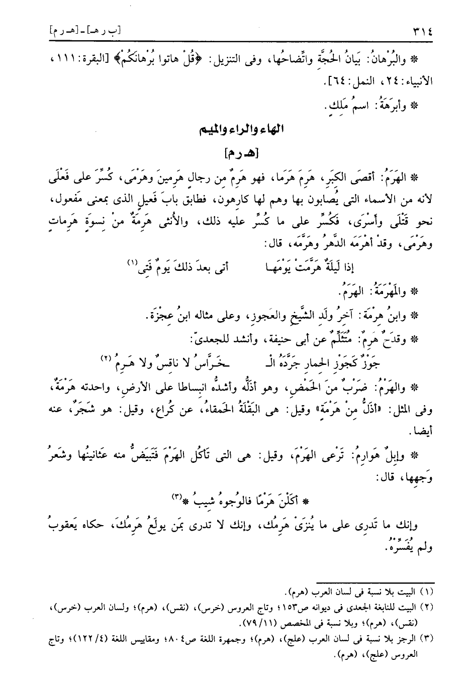 والهَرْمُ: ضرب من الحمض، وَهُوَ أذله وأشده انبساطا على الأَرْض، واحدته هَرْمَةٌ، وَفِي الْمثل: " أذلُّ من هَرْمَةٍ " وَقيل: هِيَ البقلة الحمقاء، عَن كرَاع، وَقيل: هُوَ شجر، عَنهُ أَيْضا.