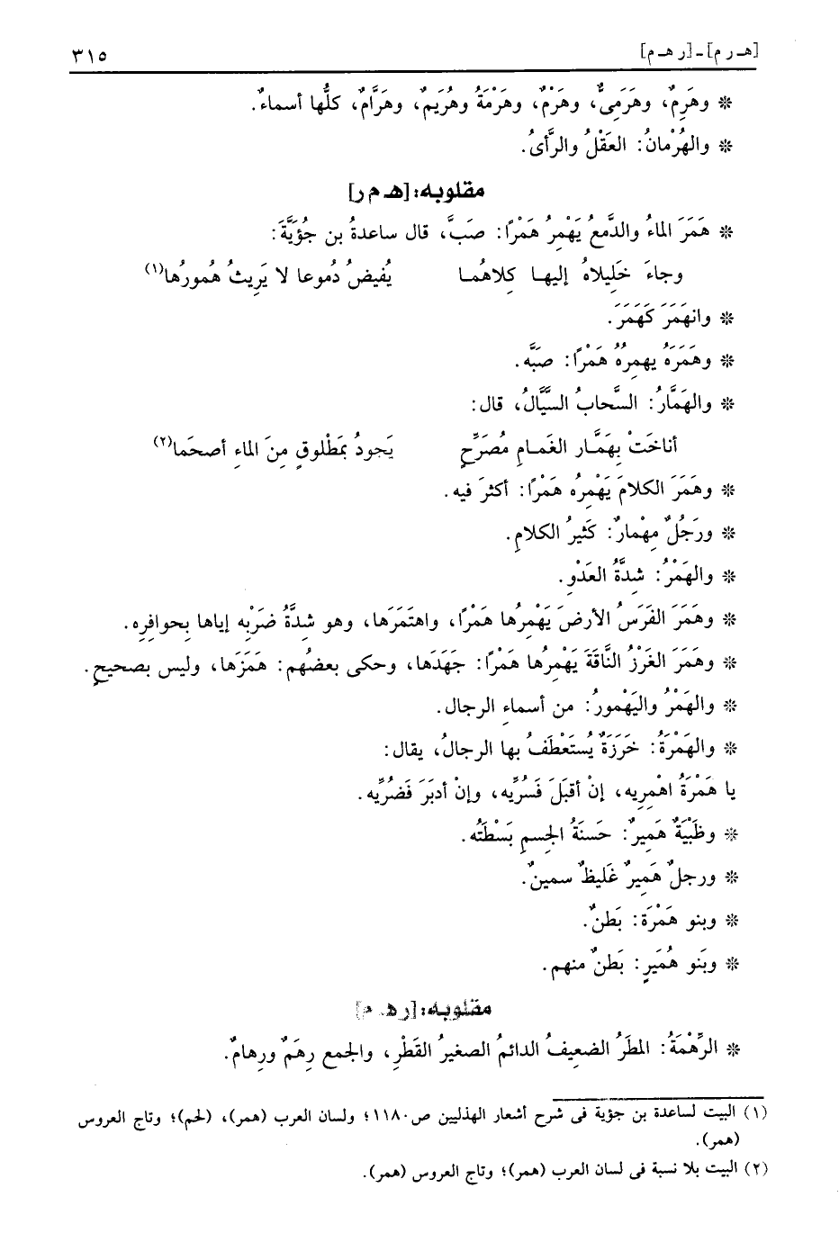 هَمَرَ المَاء والدمع يَهْمِرُ هَمْراً: صب، قَالَ سَاعِدَة بن جؤية: