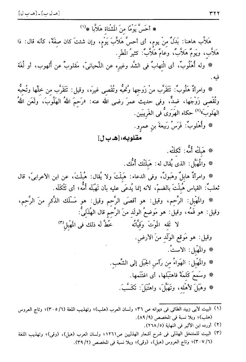 وَامْرَأَة هابِلٌ وهَبولٌ، وَفِي الدُّعَاء: هَبِلْتَ وَلَا يُقَال: هُبِلْتَ، عَن ابْن الْأَعرَابِي، قَالَ ثَعْلَب: الْقيَاس هُبِلْتَ بِالضَّمِّ، لِأَنَّهُ إِنَّمَا يدعى عَلَيْهِ بِأَن تَهْبَلَه أمه، أَي تثكله.
