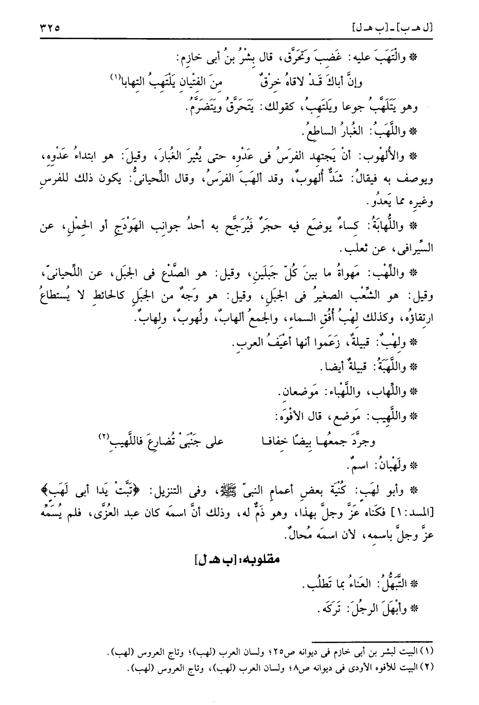 وَأَبُو لَهبٍ: كنية بعض أعمام النَّبِي صَلَّى اللهُ عَلَيْهِ وَسَلَّمَ، وَفِي التَّنْزِيل: (تَبَّتْ يَدا أبيِ لَهَبٍ) فكناه عز وَجل بِهَذَا، وَهُوَ ذمّ لَهُ، وَذَلِكَ أَن اسْمه كَانَ عبد الْعُزَّى، فَلم يُسمه عز وَجل باسمه، لِأَن اسْمه محَال.