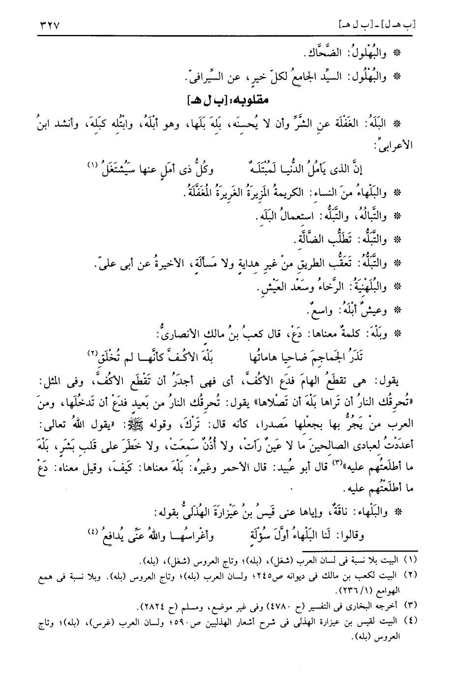 وبَلْهَ كلمة مَعْنَاهَا: دع، قَالَ كَعْب بن مَالك الْأنْصَارِيّ: