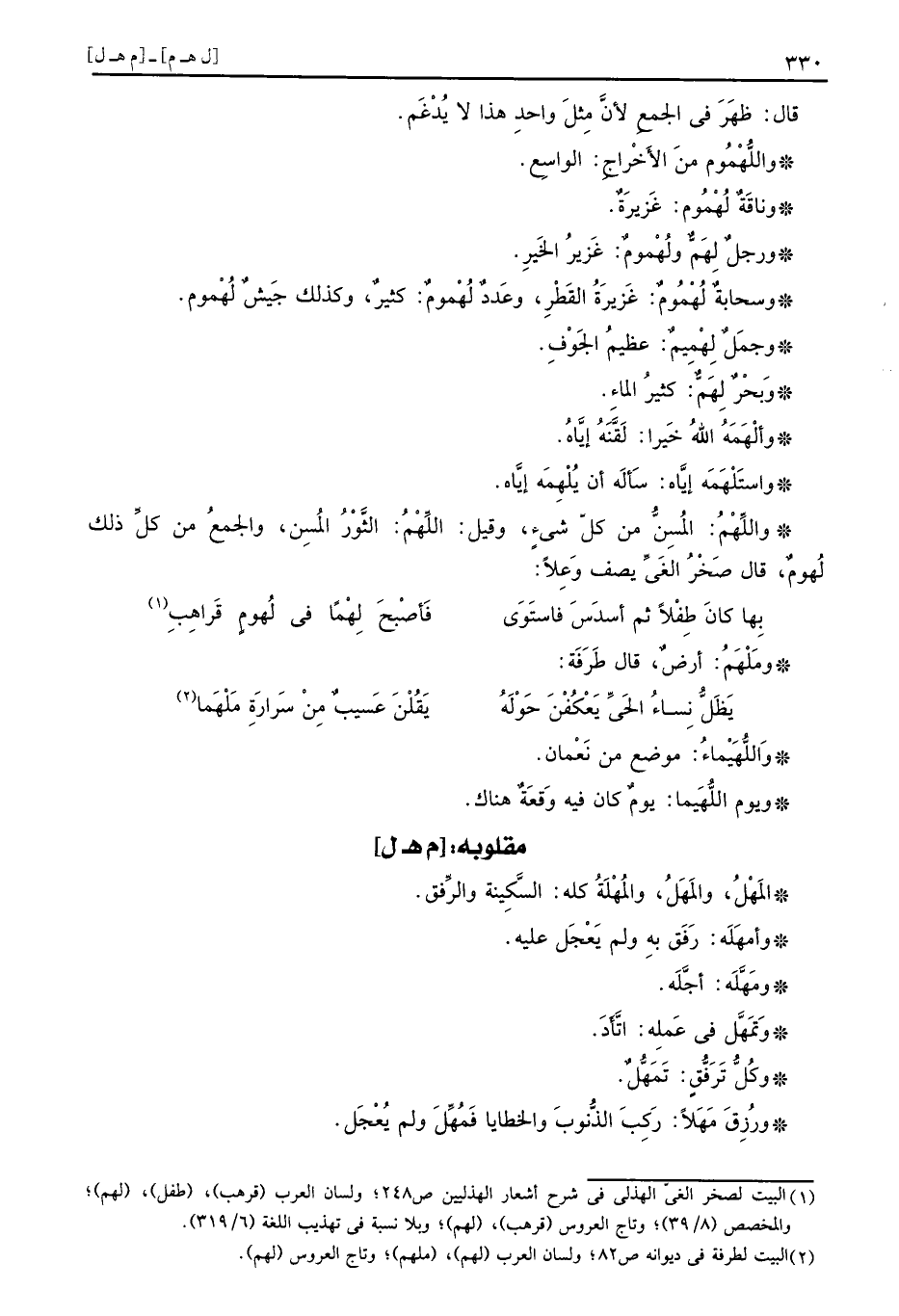 واللِّهْمُ: المسن من كل شَيْء، وَقيل: اللِّهْمُ: الثور المسن، وَالْجمع من كل ذَلِك لُهومٌ، قَالَ صَخْر الغي يصف وَعلا: