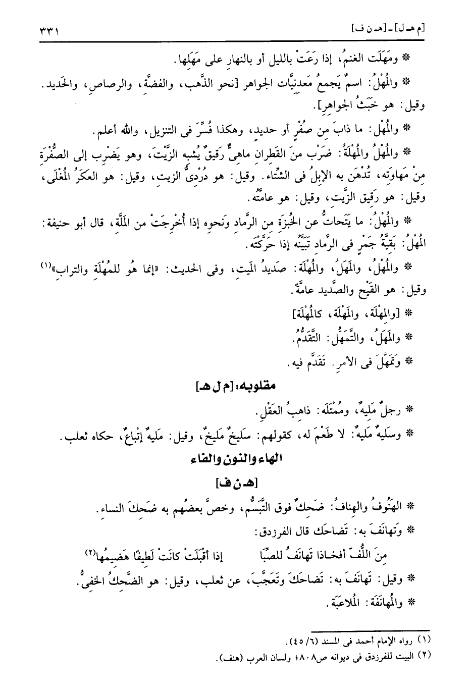 والمُهْلُ والمُهْلَةُ: ضرب من القطران مَا هِيَ رَقِيق يشبه الزَّيْت، وَهُوَ يضْرب إِلَى الصُّفْرَة من مهاواته، تدهن بِهِ الْإِبِل فِي الشتَاء. وَقيل: هُوَ دردي الزَّيْت، وَقيل هُوَ العكر المغلي، وَقيل: هُوَ رَقِيق الزَّيْت، وَقيل: هُوَ عامته.