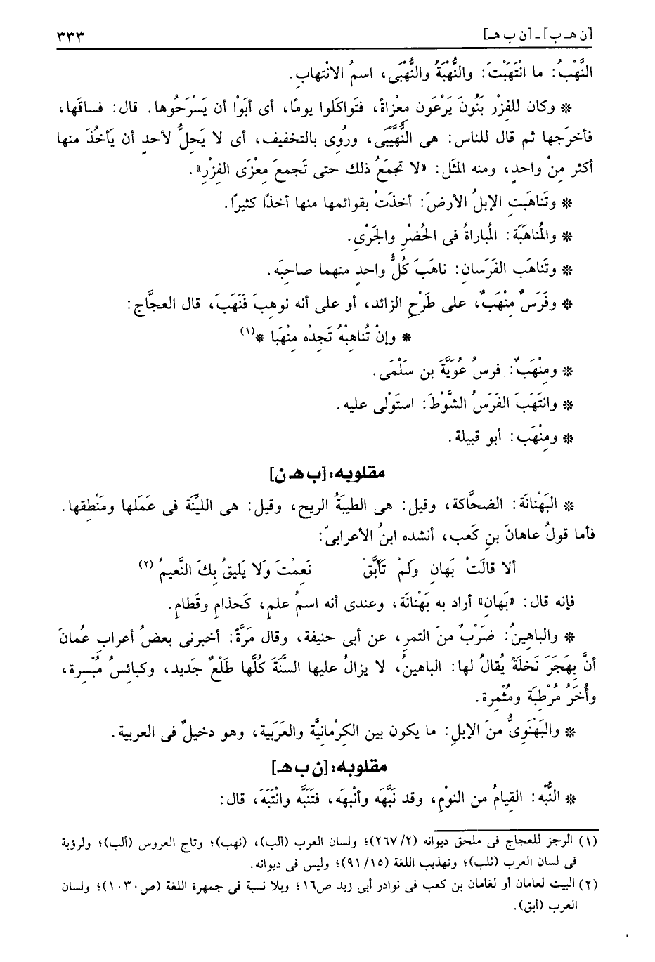 وَفرس مِنْهَبٌ، على طرح الزَّائِد، أَو على انه نوهِبَ فَنَهَبَ، قَالَ العجاج: