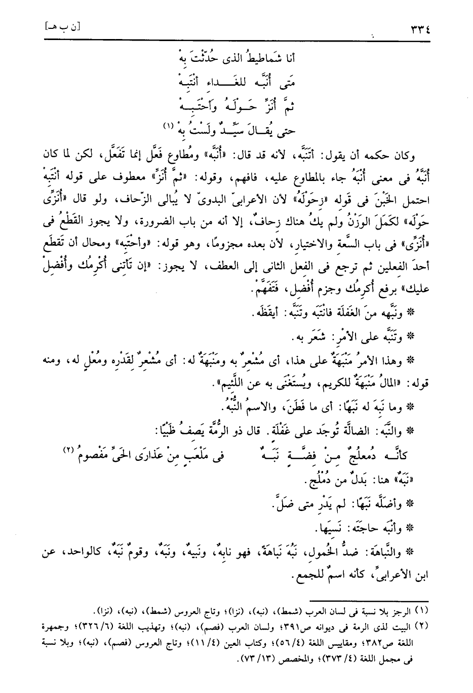 وَكَانَ حكمه أَن يَقُول: أتَنَبَّه، لِأَنَّهُ قد قَالَ: " أُنَبَّه " ومطاوع فعل إِنَّمَا تفعل، وَلَكِن لما كَانَ أُنَبَّهُ فِي معنى أُنْبهُ جَاءَ بالمطاوع عَلَيْهِ، فَافْهَم، وَقَوله: " ثمَّ أنز " مَعْطُوف على قَوْله أنْتَبِهْ احْتمل الخبن فِي قَوْله " زحوله " لِأَن الْأَعرَابِي البدوي لَا يُبَالِي الزحاف، وَلَو قَالَ " انزي حوله " لكمل الْوَزْن وَلم يَك هُنَاكَ زحاف، إِلَّا انه من بَاب الضَّرُورَة، وَلَا يجوز الْقطع فِي " انزى " فِي بَاب السعَة وَالِاخْتِيَار، لِأَن بعده مَجْزُومًا، وَهُوَ قَوْله: " وأحْتَبِه " ومحال أَن تقطع أحد الْفِعْلَيْنِ ثمَّ ترجع فِي الْفِعْل الثَّانِي إِلَى الْعَطف، لَا يجوز: " إِن تأتني أكرمك وَأفضل عَلَيْك " بِرَفْع أكرمك وَجزم أفضل، فتفهم.