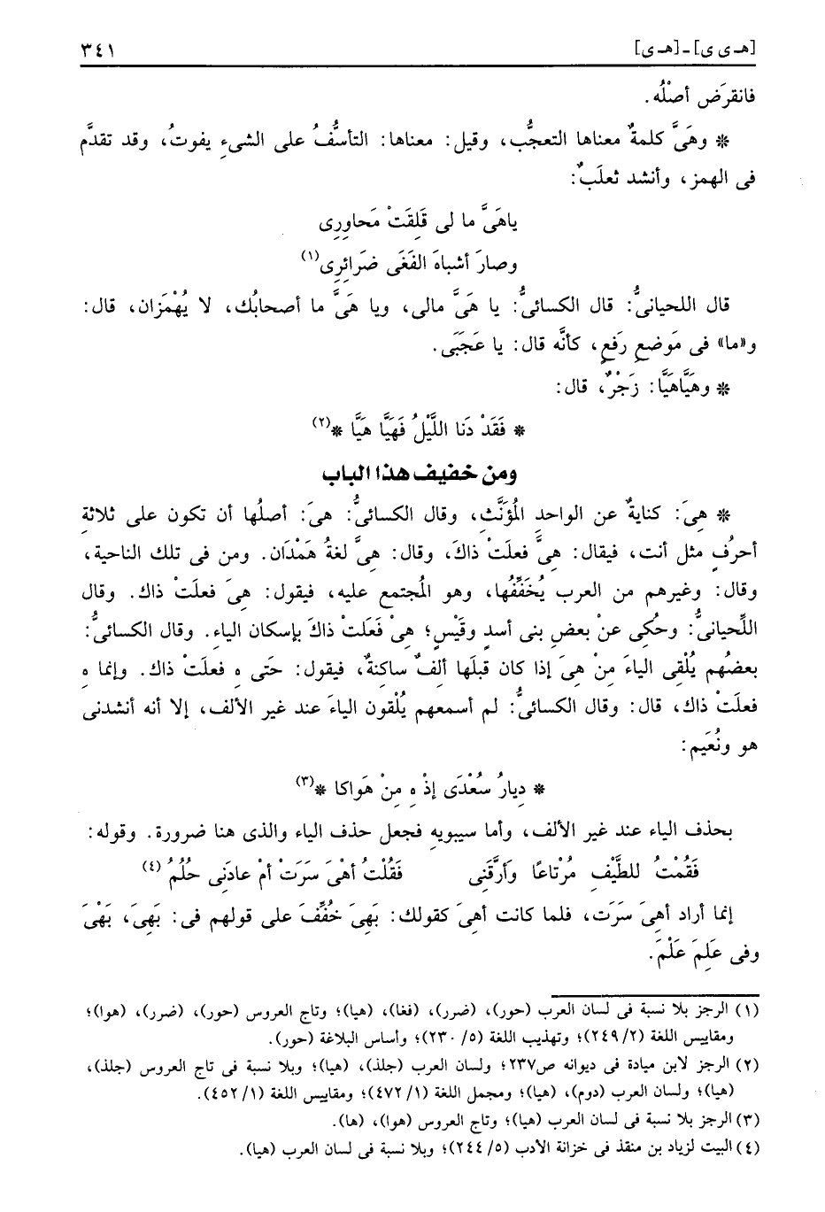 قَالَ اللحياني: قَالَ الْكسَائي: يَا هَيَّ مَالِي، وياهَيَّ مَا أَصْحَابك، لَا يهمزان، قَالَ: و" مَا " فِي مَوضِع رفع، كَأَنَّهُ قَالَ: يَا عجبي.