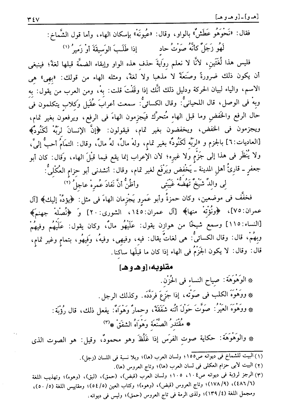 فَلَيْسَ لغتين، لأَنا لَا نعلم رِوَايَة حذف هَذِه الْوَاو وإبقاء الضمة قبلهَا لُغَة، فَيَنْبَغِي أَن يكون ذَلِك ضَرُورَة وصنعة لَا مذهبا وَلَا لُغَة، وَمثله الْهَاء من قَوْلك: " بهي " هِيَ الِاسْم، وَالْيَاء لبَيَان الْحَرَكَة وَدَلِيل ذَلِك أَنَّك إِذا وقفت قلت: بِهِ، وَمن الْعَرَب من يَقُول: بِهِ وبِهْ فِي الْوَصْل، قَالَ اللحياني: وَقَالَ الْكسَائي: سَمِعت أَعْرَاب عقيل وكلاب يَتَكَلَّمُونَ فِي حَال الرّفْع والخفض وَمَا قبل الْهَاء متحرك فيجزمون الْهَاء فِي الرّفْع، ويرفعون بِغَيْر تَمام، ويجزمون فِي الْخَفْض، ويخفضون بِغَيْر تَمام، فيقلون: (إنَّ الإنسانَ لِرَبِّهِ لَكَنُودٌ) بِالْجَزْمِ و" لِرَبِّهِ لَكَنُودٌ " بِغَيْر تَمام، ولهْ مالٌ، لهُ مالٌ، وَقَالَ: التَّمام احب أَلِي، وَلَا ينظر فِي هَذَا إِلَى جزم وَلَا غَيره، لِأَن الْإِعْرَاب إِنَّمَا يَقع فِيمَا قبل الْهَاء، وَقَالَ: كَانَ أَبُو جَعْفَر، قَارِئ أهل الْمَدِينَة، يخْفض وَيرْفَع لغير تَمام، وَقَالَ: أَنْشدني أَبُو حزَام العكلي: