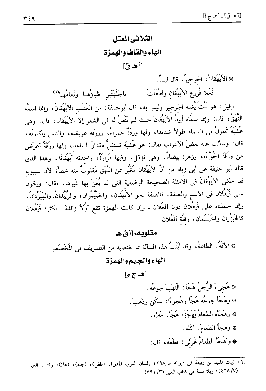 وَقيل: هُوَ نبت يشبه الجرجير وَلَيْسَ بِهِ، قَالَ أَبُو حنيفَة: من العشب الأيْهُقانِ، وَإِنَّمَا اسْمه النَّهَقُ، قَالَ: وَإِنَّمَا سَمَّاهُ لبيد الأيْهُقانِ حَيْثُ لم يتَّفق لَهُ فِي الشّعْر إِلَّا الأيْهُقان، قَالَ: وَهِي عشبة تطول فِي السَّمَاء طولا شَدِيدا، وَلها وردة حَمْرَاء، وورقة عريضة، وَالنَّاس يَأْكُلُونَهُ، قَالَ: وَسَأَلت عَنهُ بعض الْأَعْرَاب فَقَالَ: هُوَ عشبة تستقل مِقْدَار الساعد، وَلها ورقة أعرض من ورقة الحَّواءة، وزهرة بَيْضَاء، وَهِي تُؤْكَل، وفيهَا مرَارَة، واحدته أيْهُقانَة، وَهَذَا الَّذِي قَالَه أَبُو حنيفَة عَن أبي زِيَاد من أنَّ الأيْهُقان مغير عَن النهق مقلوب مِنْهُ خطأ، لِأَن سِيبَوَيْهٍ قد حكى الأيْهُقانَ فِي الْأَمْثِلَة الصَّحِيحَة الوضعية الَّتِي لم يعن بهَا غَيرهَا، فَقَالَ: وَيكون على فيعلان فِي الِاسْم وَالصّفة، فالصفة نَحْو الأيْهُقان، والضميران، والزيبدان، والهيردان، وَإِنَّمَا حملناه على فيعلان دون أفعلان، وَإِن كَانَت الْهمزَة تقع أَولا زَائِدَة، لِكَثْرَة فيعلان كالخيزران والحيسمان، وَقلة أفعلان.