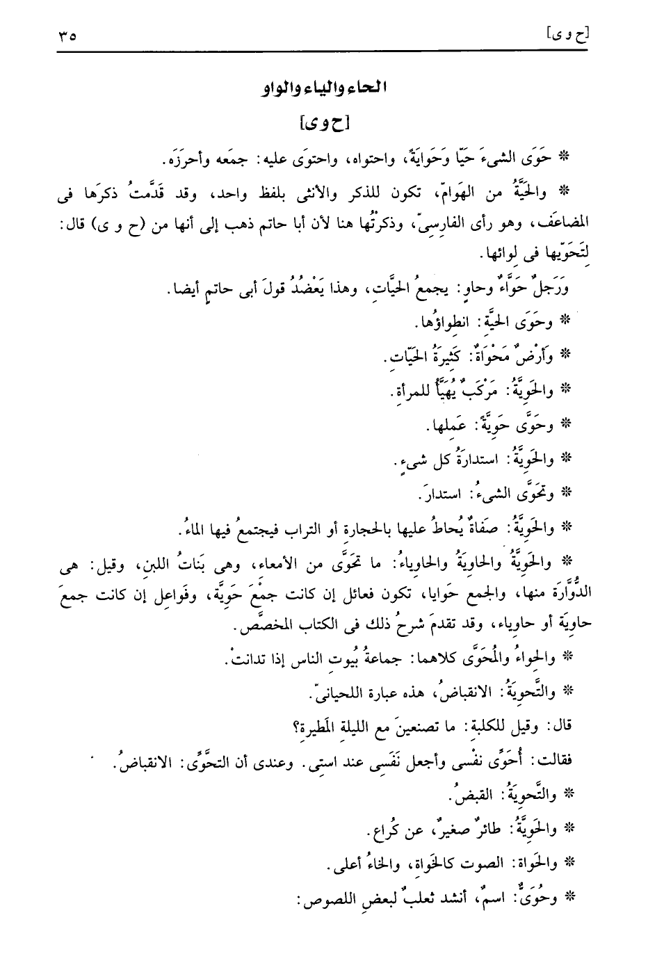 والحَيَّةُ من الْهَوَام، تكون للذّكر وَالْأُنْثَى بِلَفْظ وَاحِد، وَقد قدمت ذكرهَا فِي المضاعف، وَهُوَ رَأْي الْفَارِسِي، وذكرتها هُنَا لِأَن أَبَا حَاتِم ذهب إِلَى إِنَّهَا من " ح وى " قَالَ: لِتَحَوّيها فِي لوائها. وَرجل حَوَّاءٌ وحاوٍ: يجمع الْحَيَّات، وَهَذَا يعضد قَول أبي حَاتِم أَيْضا.