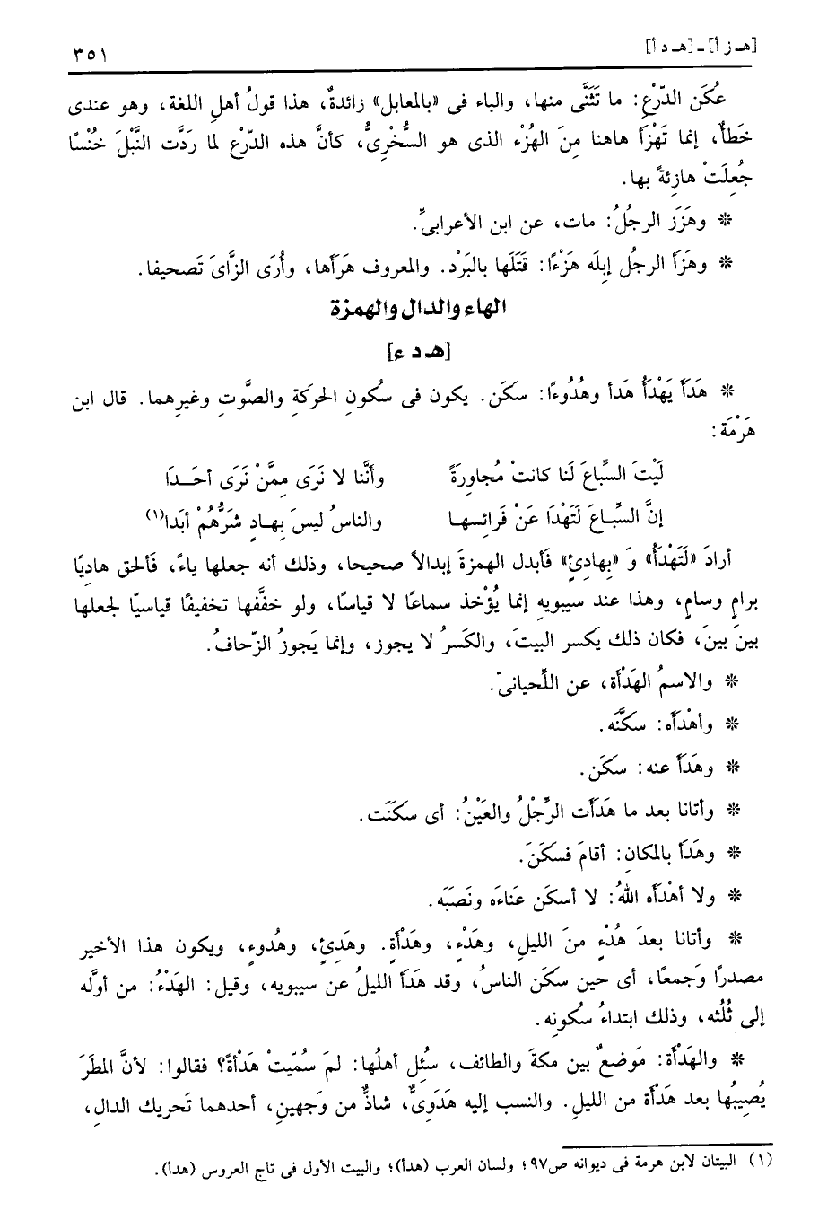 والهَدْأَة: مَوضِع بَين مَكَّة والطائف، سُئِلَ أَهلهَا: لم سميت هَدْأةً؟ فَقَالُوا: لِأَن الْمَطَر يُصِيبهَا بعد هَدْأَة من اللَّيْل، وَالنّسب إِلَيْهِ هَدَوِيٌّ، شَاذ من وَجْهَيْن، أَحدهمَا تَحْرِيك الدَّال،