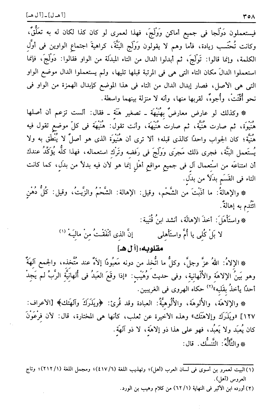 والإلاهَة، والأُلوهَة، والأُلُوهِيَّةُ: الْعِبَادَة وَقد قرئَ: (ويَذَرَك وآلهَتك) ، (ويَذَرَك وإلاهَتَك) وَهَذِه الْأَخِيرَة عَن ثَعْلَب، كَأَنَّهَا هِيَ المختارة، قَالَ: لِأَن فِرْعَوْن كَانَ يُعبد وَلَا يَعبد، فَهُوَ على هَذَا ذُو إلاهَةٍ، لَا ذُو آلهَةٍ.