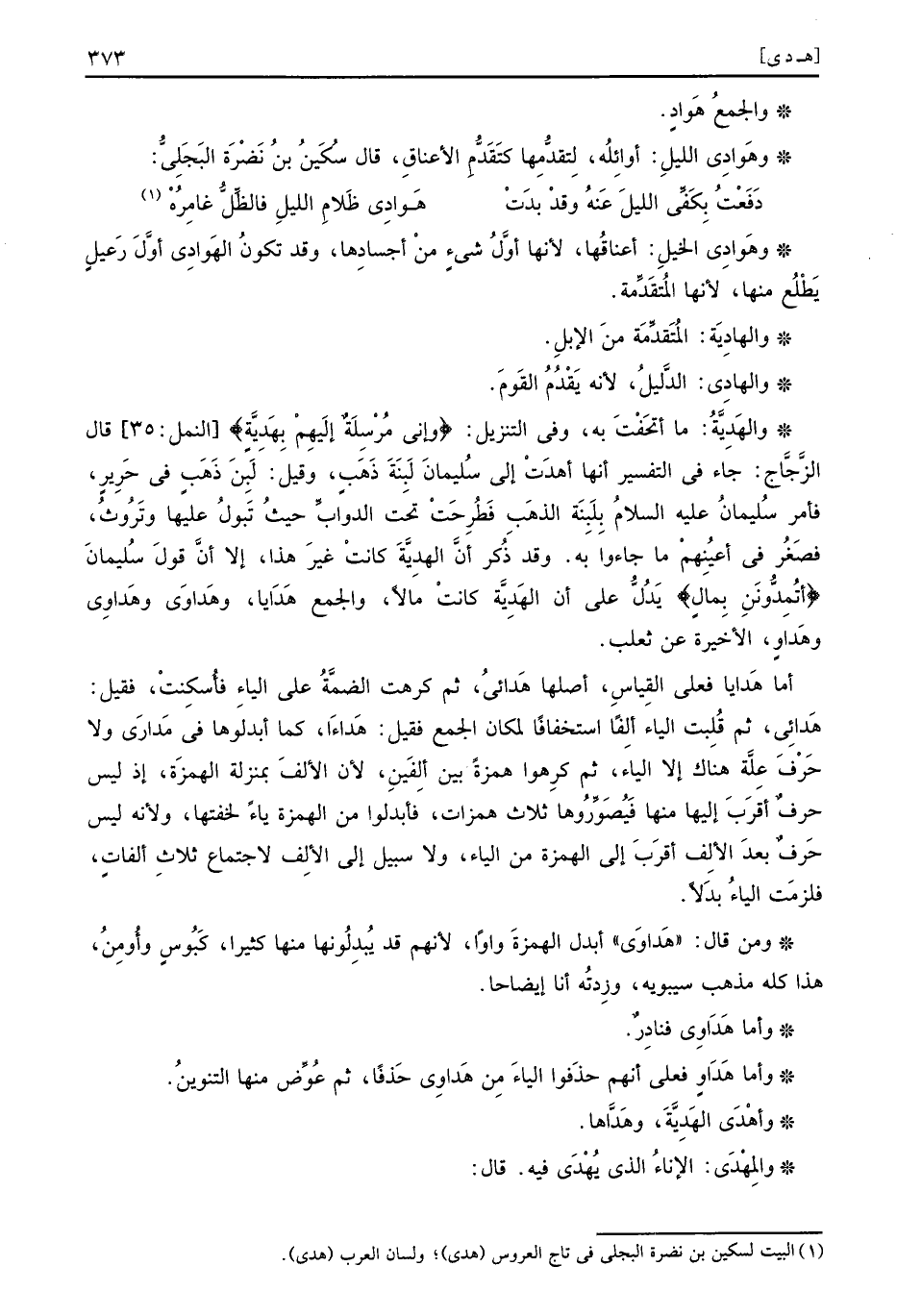 والهَدِيَّةُ: مَا أتحفت بِهِ، وَفِي التَّنْزِيل: (وإِنِّي مُرْسِلَةٌ إلَيِهمْ بِهَدِيَّةٍ) قَالَ الزّجاج: جَاءَ فِي التَّفْسِير إِنَّهَا أَهْدَت إِلَى سُلَيْمَان لبنة ذهب، وَقيل: لبن ذهب فِي حَرِير، فَأمر سُلَيْمَان عَلَيْهِ السَّلَام بلبنة الذَّهَب فطرحت تَحت الدَّوَابّ حَيْثُ تبول عَلَيْهَا وتروث، فصغر فِي أَعينهم مَا جَاءُوا بِهِ. وَقد ذكر أَن الهدِيَّةَ كَانَت غير هَذَا، إِلَّا أَن قَول سُلَيْمَان (أَتُمِدُّونَنِ بِمالٍ) يدل على أَن الْهَدِيَّة كَانَت مَالا، وَالْجمع هَدَايا، وهَداوَي، وهَداوِي وهَداوٍ، الْأَخِيرَة عَن ثَعْلَب.