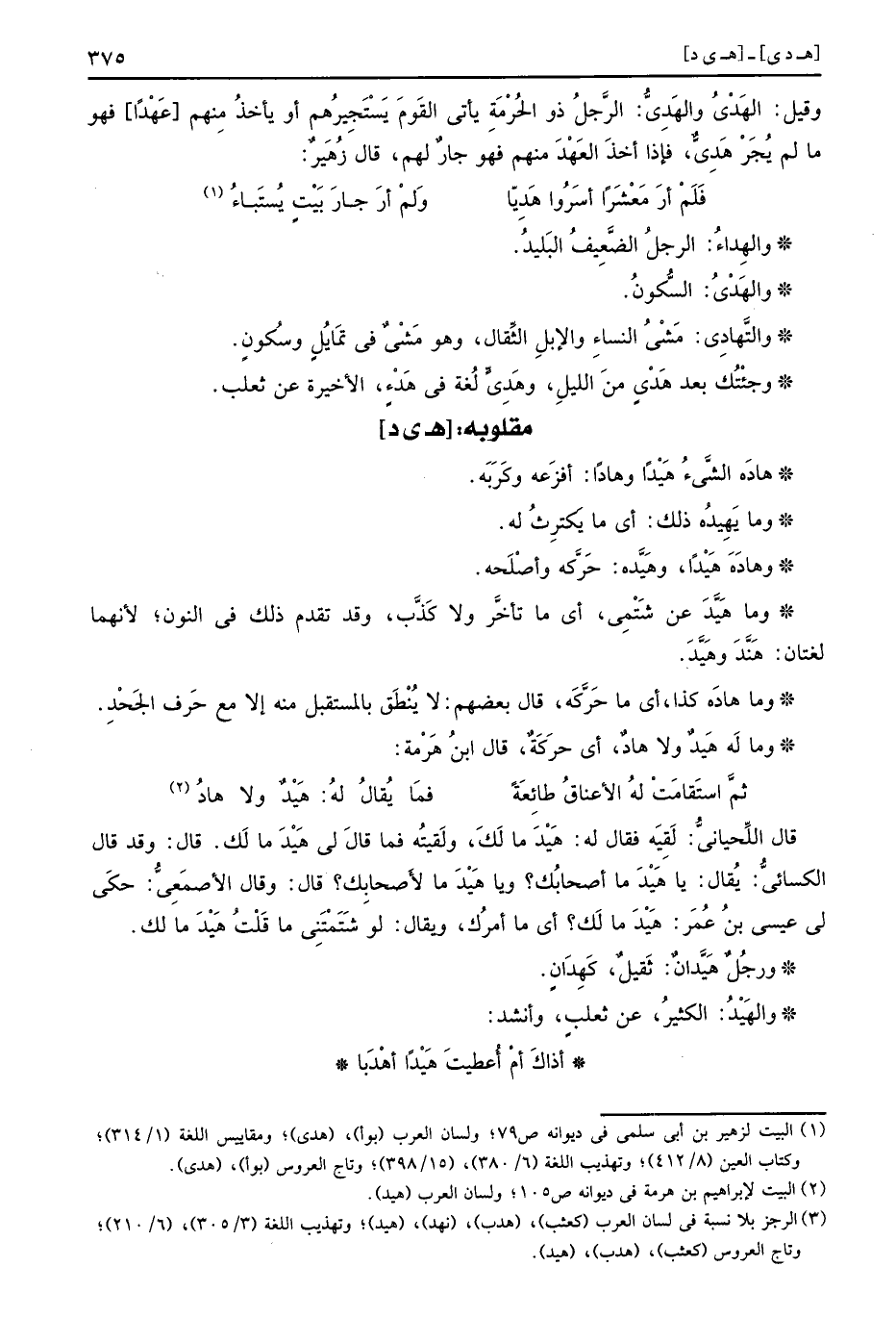 وَقيل: الهَدْيُ والهَدِيُّ: الرجل ذُو الْحُرْمَة يَأْتِي الْقَوْم يستجيرهم أَو يَأْخُذ مِنْهُم عهدا فَهُوَ مَا لم يجر هَدِيٌّ. فَإِذا أَخذ الْعَهْد مِنْهُم فَهُوَ جَار لَهُم، قَالَ زُهَيْر: