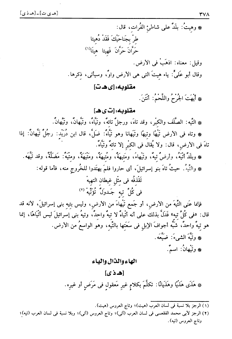 فَإِنَّمَا عَنى التِّيهَ من الأَرْض، أَو جمع تَيْهاءَ من الأَرْض، وَلَيْسَ بتِيهِ بني إِسْرَائِيل، لِأَنَّهُ قد قَالَ: " فِي كل تيه " فَدلَّ بذلك على انه أتْياهٌ لَا تِيهٌ وَاحِد، وتيهُ بني إِسْرَائِيل لَيْسَ أتْياها، إِنَّمَا هُوَ تِيهٌ وَاحِد، شبه أَجْوَاف الْإِبِل فِي سعتها بالتِّيهِ، وَهُوَ الْوَاسِع من الأَرْض.