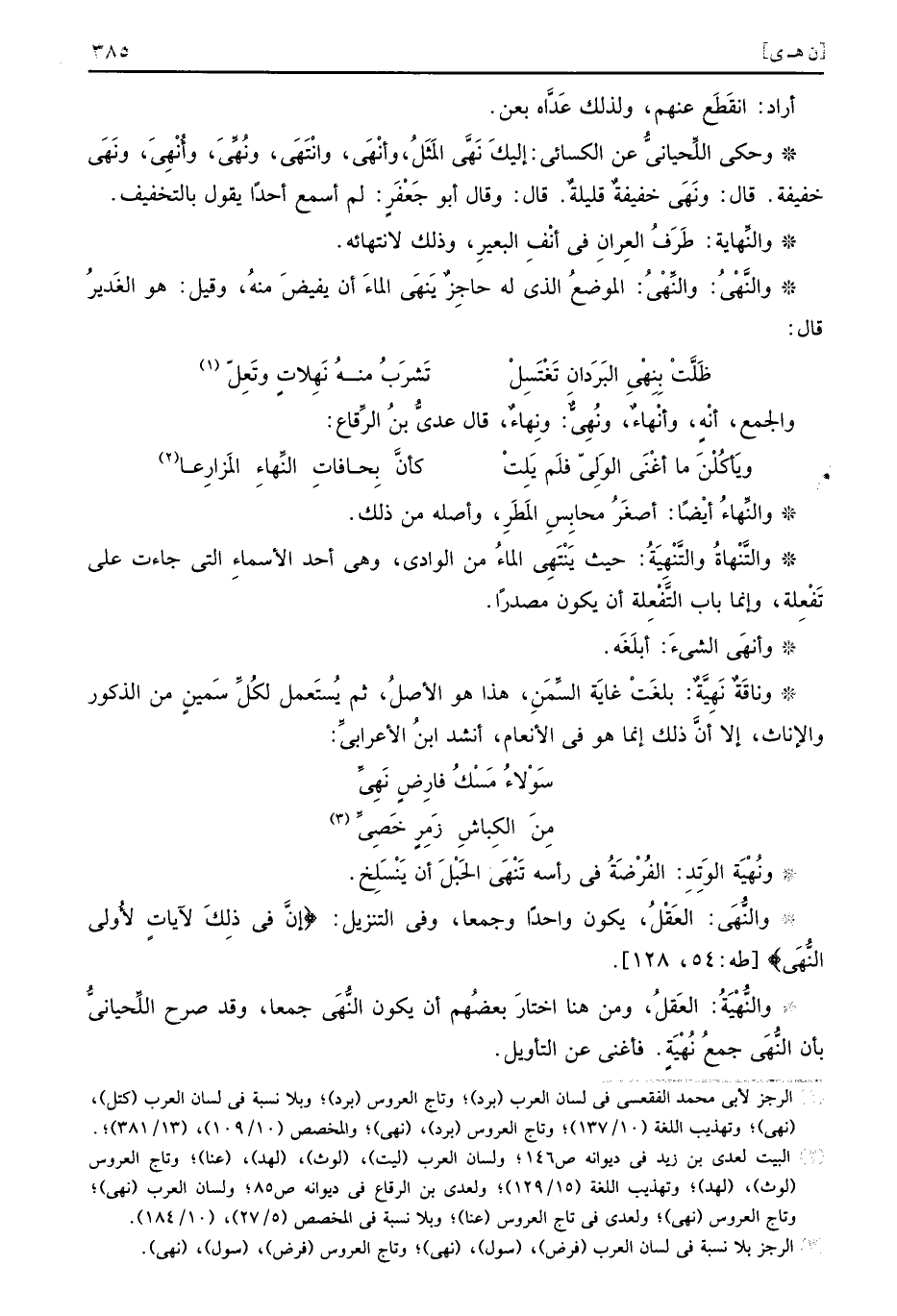 وَالْجمع، أنْهٍ، وأنْهاءٌ، ونُهِىٌّ: ونِهاءٌ، قَالَ عدي بن الرّقاع: