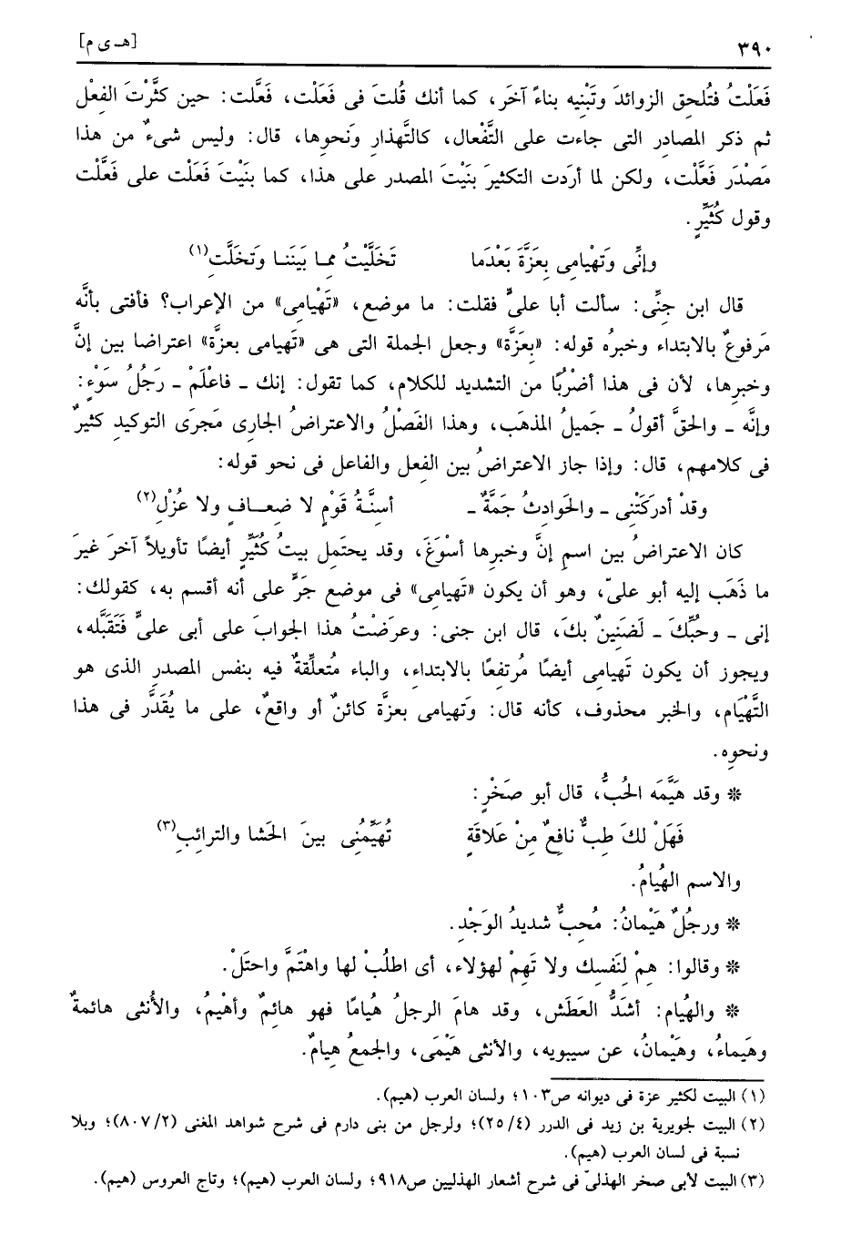 قَالَ ابْن جني: سَأَلت أَبَا عَليّ فَقلت: مَا مَوضِع، " تهيامي " من الْإِعْرَاب؟ فَأفْتى بِأَنَّهُ مَرْفُوع بِالِابْتِدَاءِ وَخَبره قَوْله: " بعزة " وَجعل الْجُمْلَة الَّتِي هِيَ " تهيامي بعزة " اعتراضا بَين إِن وخبرها، لِأَن فِي هَذَا أضربا من التَّشْدِيد للْكَلَام، كَمَا تَقول: إِنَّك، فَاعْلَم، رجل سوء: وَإنَّهُ، وَالْحق أَقُول، جميل الْمَذْهَب، وَهَذَا الْفَصْل والاعتراض الْجَارِي مجْرى التوكيد كثير فِي كَلَامهم، قَالَ: وَإِذا جَازَ الِاعْتِرَاض بَين الْفِعْل وَالْفَاعِل فِي نَحْو قَوْله: