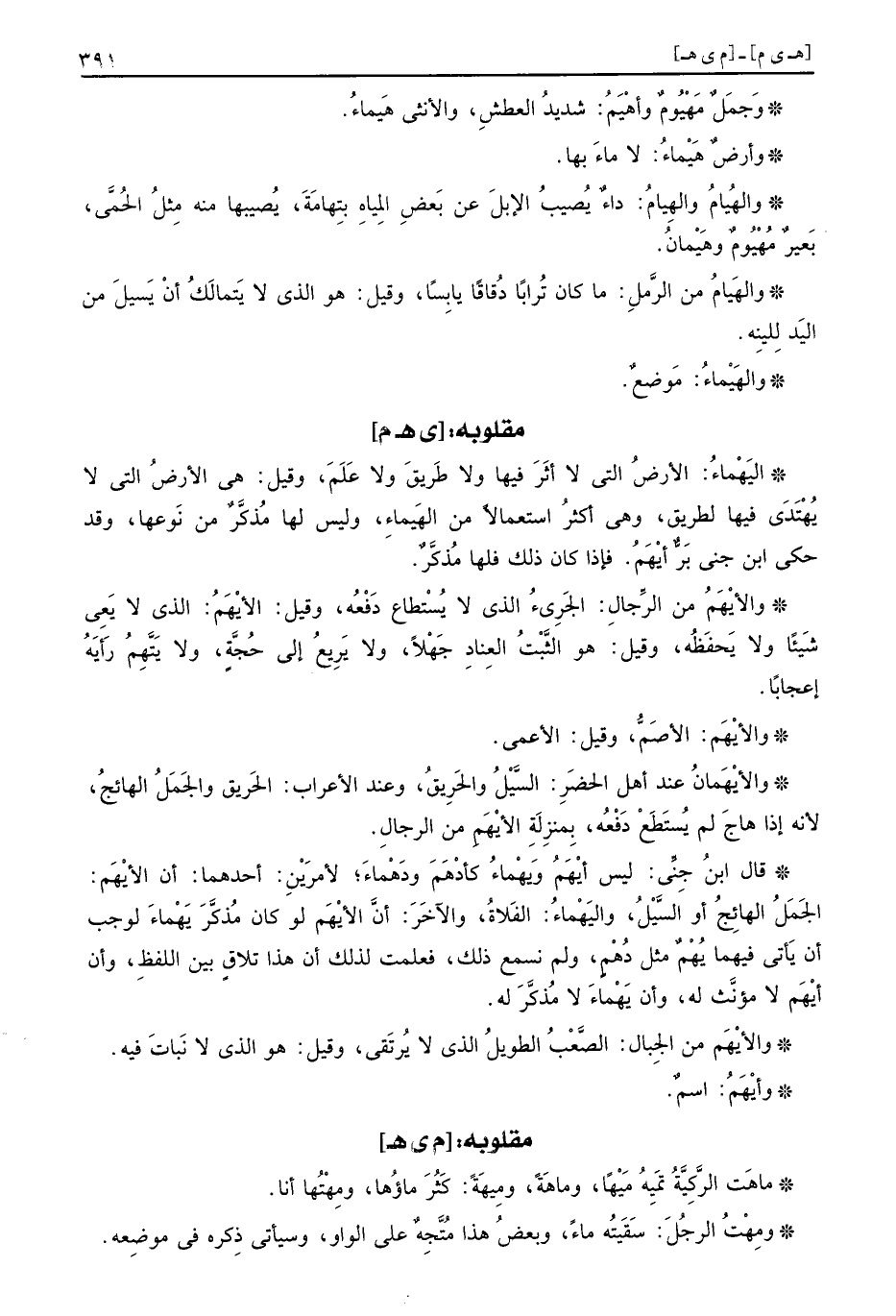قَالَ ابْن جني: لَيْسَ أيْهَمُ ويَهْماءُ كأدْهَمَ ودَهْماءَ، لأمرين: أَحدهمَا: أَن الأيْهَم: الْجمل الهائج أَو السَّيْل، واليَهْماءُ: الفلاة، وَالْآخر: أَن الأيْهَم لَو كَانَ مُذَكّر يَهْماءَ لوَجَبَ أَن يَأْتِي فيهمَا يُهْمٌ مثل دهم، وَلم نسْمع ذَلِك، فَعلمت لذَلِك أَن هَذَا تلاق بَين اللَّفْظ، وَأَن أيْهَم لَا مؤنث لَهُ، وَأَن يَهْماءَ لَا مُذَكّر لَهُ.