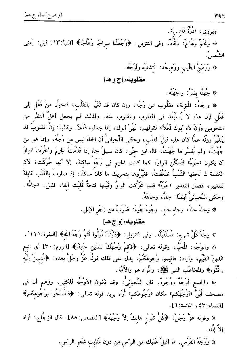 وَالْجمع أوْجُهٌ ووُجُوهٌ. قَالَ اللحياني: وَقد تكون الْأَوْجه للكثير، وَزعم أَن فِي مصحف أبي " أوْجُهكم " مَكَان " وُجُوهكم " أرَاهُ يُرِيد قَوْله تَعَالَى: (فامْسَحُوا بوُجُوهِكم) .