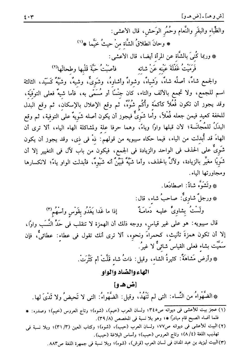 وَالْجمع شاءٌ، أَصله شاهٌ، وشِياهٌ، وشِواهٌ وأشاوِهُ، وشَوِىٌّ، وشِيهٌ، وشَيِّهٌ كسيد، الثَّالِثَة اسْم للْجمع، وَلَا تجمع بِالْألف وَالتَّاء، كَانَ جِنْسا أَو مُسَمّى بِهِ، فَأَما شِيهٌ فعلى التوفية، وَقد يجوز أَن تكون فعلا كأكمة وأكم شُوُهٌ، ثمَّ وَقع الإعلال بالإسكان، ثمَّ وَقع الْبَدَل للخفة كعيد فِيمَن جعله فعلا، وَأما شوى فَيجوز أَن يكون أَصله شَوِيهٌ على التوفيه، ثمَّ وَقع الْبَدَل للمجانسة، لِأَن قبلهَا واوا وياء، وهما حرفا عِلّة ولمشاكلة الْهَاء الْيَاء، أَلا ترى أَن الْهَاء قد أبدلت من الْيَاء، فِيمَا حَكَاهُ سِيبَوَيْهٍ من قَوْلهم: ذه فِي ذِي، وَقد يجوز أَن يكون شَوِىٌّ على الْحَذف فِي الْوَاحِد وَالزِّيَادَة فِي الْجمع، فَيكون من بَاب لآل فِي التَّغْيِير إِلَّا أَن شَوِيًّا مغير بِالزِّيَادَةِ، ولآل بالحذف، وَأما شَيِّهٌ فَبين شَيْوِهٌ، فأبدلت الْوَاو يَاء، لانكسارها ومجاورتها الْيَاء.