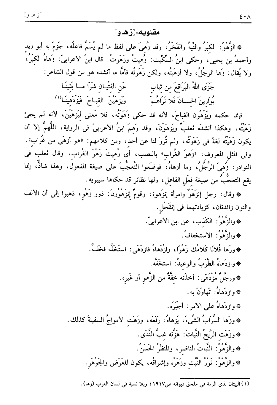 فَإِنَّمَا حكمه ويَزْهُونَ القباح، لِأَنَّهُ قد حكى زَهَوْتُه، فَلَا معنى لِيِزهَيْنَ، لِأَنَّهُ لم يَجِيء زَهَيْتُه، وَهَكَذَا أنْشدهُ ثَعْلَب ويَزهَوْنَ، وَقد وهم ابْن الْأَعرَابِي فِي الرِّوَايَة، اللَّهُمَّ إِلَّا أَن يكون زَهَيْتُه لُغَة فِي زَهَوْتُه، وَلم ترو لنا عَن أحد، وَمن كَلَامهم: " هُوَ أزهَى من غراب ". وَفِي الْمثل الْمَعْرُوف: " زَهوَ الْغُرَاب " بِالنّصب، أَي زُهِيتَ زَهْوَ الْغُرَاب، وَقَالَ ثَعْلَب فِي النَّوَادِر: زُهِىَ الرجل، وَمَا أزهاهُ، فوضعوا التَّعَجُّب على صِيغَة الْمَفْعُول، وَهَذَا شَاذ، إِنَّمَا يَقع التَّعَجُّب من صِيغَة فعل الْفَاعِل، وَلها نَظَائِر قد حَكَاهَا سِيبَوَيْهٍ.