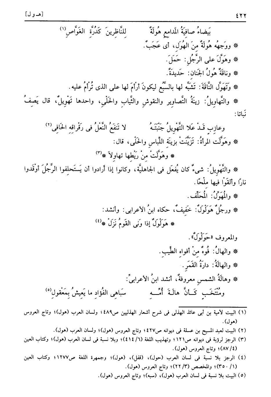 وهَوَّلَت الْمَرْأَة: تزينت بزينة اللبَاس والحلي، قَالَ: