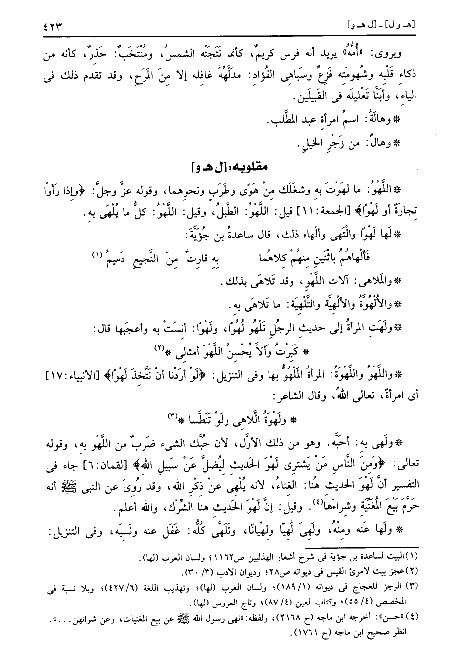 ولَهَى بِهِ: أحبه، وَهُوَ من ذَلِك الأول، لِأَن حبك لشَيْء ضرب من اللَّهْو بِهِ، وَقَوله تَعَالَى: (وَمِنَ النَّاسِ مَنْ يَشترِي لَهْوَ الحَديثِ لِيُضِلَّ عَنْ سَبِيلِ الله) جَاءَ فِي التَّفْسِير أَن لَهْوَ الحَدِيث هُنَا: الْغناء، لِأَنَّهُ يُلْهِى عَن ذكر الله، وَقد روى عَن النَّبِي صَلَّى اللهُ عَلَيْهِ وَسَلَّمَ انه حرم بيع الْمُغنيَة وشراءها. وَقيل: إِن لَهْوَ الحَدِيث هُنَا الشّرك، وَالله أعلم.