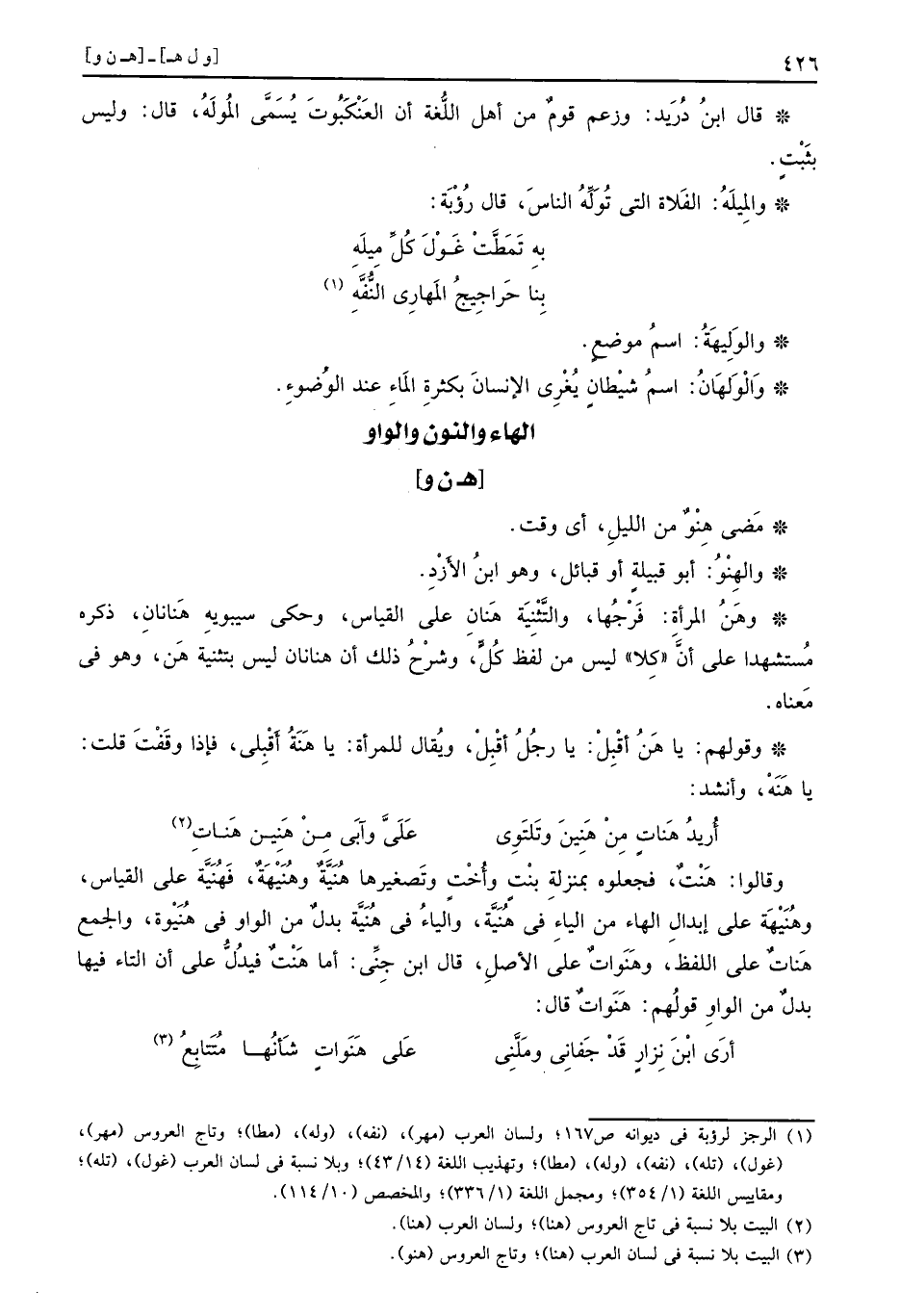 وَقَوْلهمْ: يَا هَنُ أقبل: يَا رجل أقبل، وَيُقَال للْمَرْأَة: يَا هَنَةُ أقبلي، فَإِذا وقفت قلت: يَا هَنَهْ، وَأنْشد: