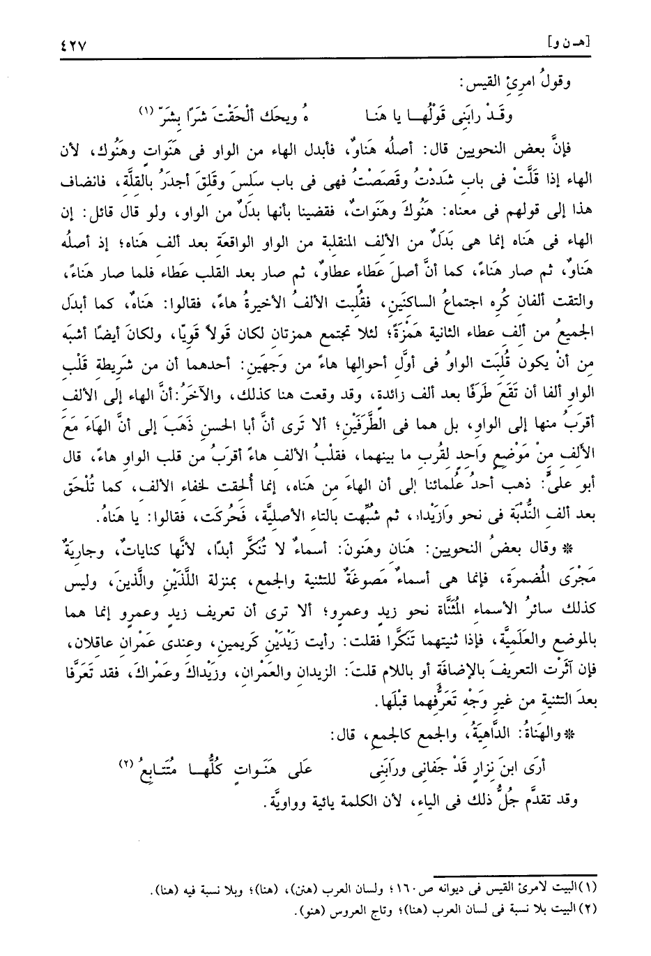 وَقَالَ بعض النَّحْوِيين: هنان وهنون: أَسمَاء لَا تنكر أبدا، لِأَنَّهَا كنايات، وَجَارِيَة مجْرى المضمرة، فَإِنَّمَا هِيَ أَسمَاء مصوغة للتثنية، وَالْجمع بِمَنْزِلَة اللَّذين وَالَّذين، وَلَيْسَ كَذَلِك سَائِر الْأَسْمَاء الْمُثَنَّاة نَحْو زيد وَعَمْرو، أَلا ترى أَن تَعْرِيف زيد وَعَمْرو إِنَّمَا هما بِالْوَضْعِ والعلمية، فَإِذا ثنيتهما تنكرا فَقلت: رَأَيْت زيدين كريمين، وَعِنْدِي عمرَان عاقلان، فَإِن آثرت التَّعْرِيف بِالْإِضَافَة أَو بِاللَّامِ قلت: الزيدان والعمران، وزيداك وعمراك، فقد تعرفا بعد التَّثْنِيَة من غير وَجه تعرفهما قبلهَا.