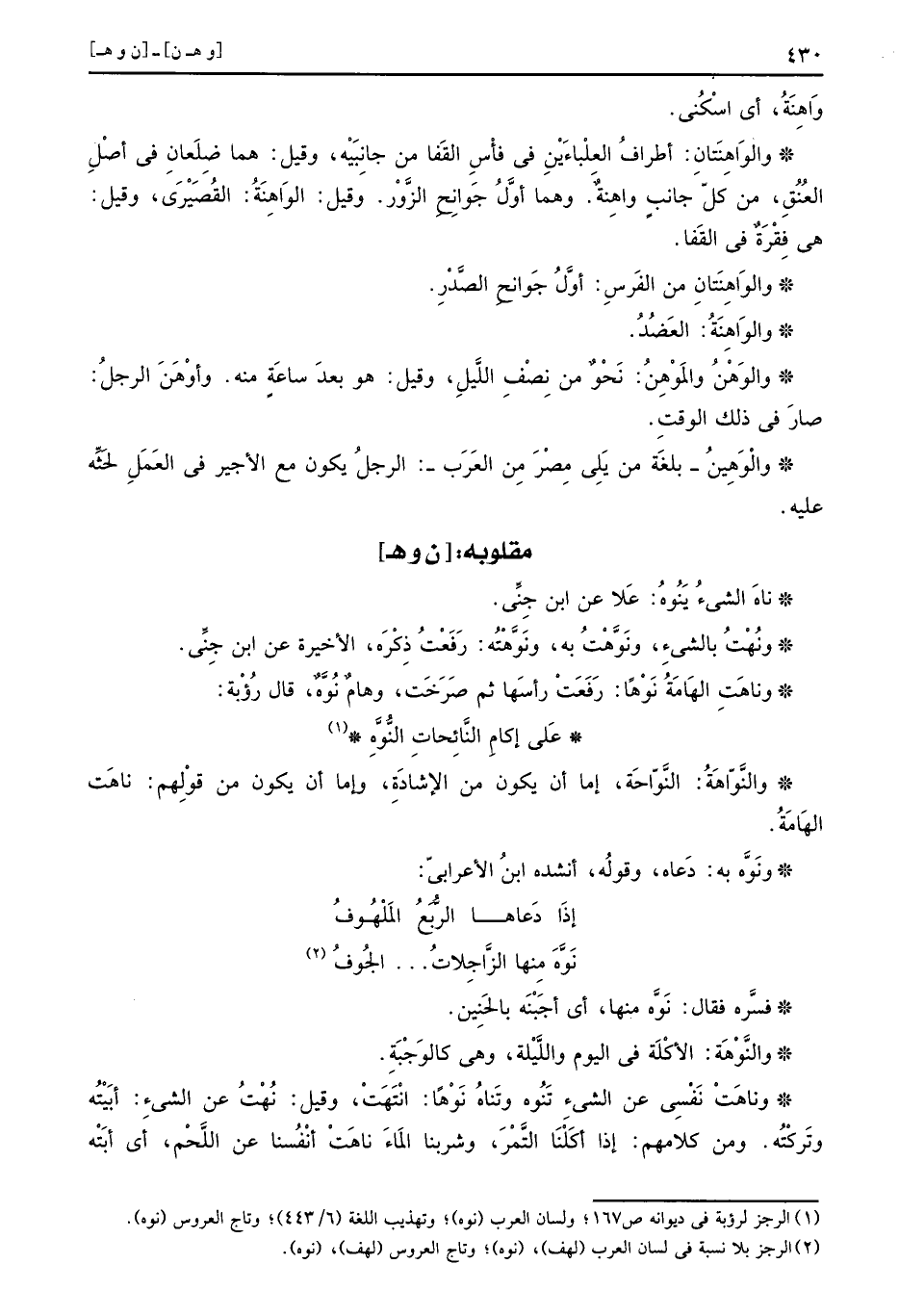 والوَهْنُ والمَوْهِنُ: نَحْو من نصف اللَّيْل، وَقيل: هُوَ بعد سَاعَة مِنْهُ. وأوَْنَ الرجل: صَار فِي ذَلِك الْوَقْت.
