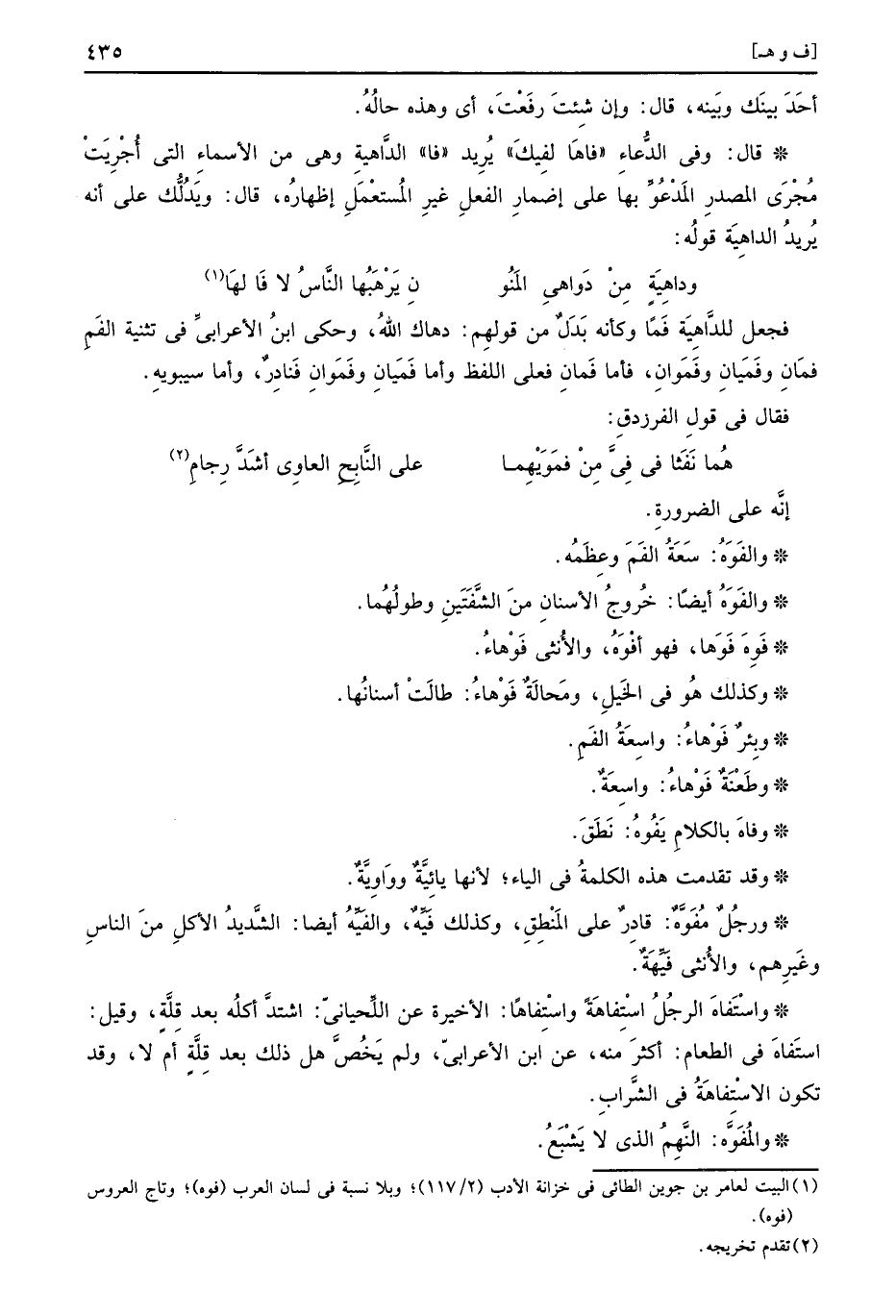 فَجعل للداهية فَماً وَكَأَنَّهُ بدل من قَوْلهم: دهاك الله، وَحكى ابْن الْأَعرَابِي فِي تَثْنِيَة الفَمِ فمَانِ وفَميَانِ وفَموَانِ، فَأَما فَمانِ فعلى اللَّفْظ وَأما فَميَانِ وفَمَوانِ فنادر، وَأما سِيبَوَيْهٍ فَقَالَ فِي قَول الفرزدق: