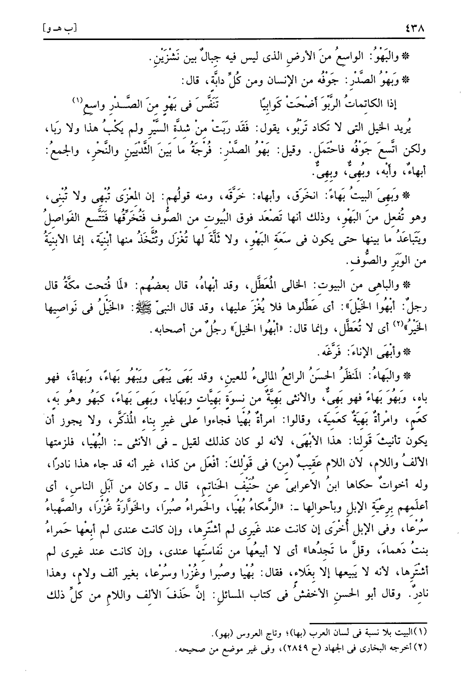 والباهِي من الْبيُوت: الْخَالِي الْمُعَطل، وَقد أبْهاهُ، قَالَ بَعضهم: " لما فتحت مَكَّة قَالَ رجل: أبْهُوا الْخَيل ": أَي عطلوها فَلَا يغز عَلَيْهَا، وَقد قَالَ النَّبِي صَلَّى اللهُ عَلَيْهِ وَسَلَّمَ: " الْخَيل فِي نَوَاصِيهَا الْخَيْر " أَي لَا تعطل، وَإِنَّمَا قَالَ: " أبْهُوا الْخَيل " رجل من أَصْحَابه.