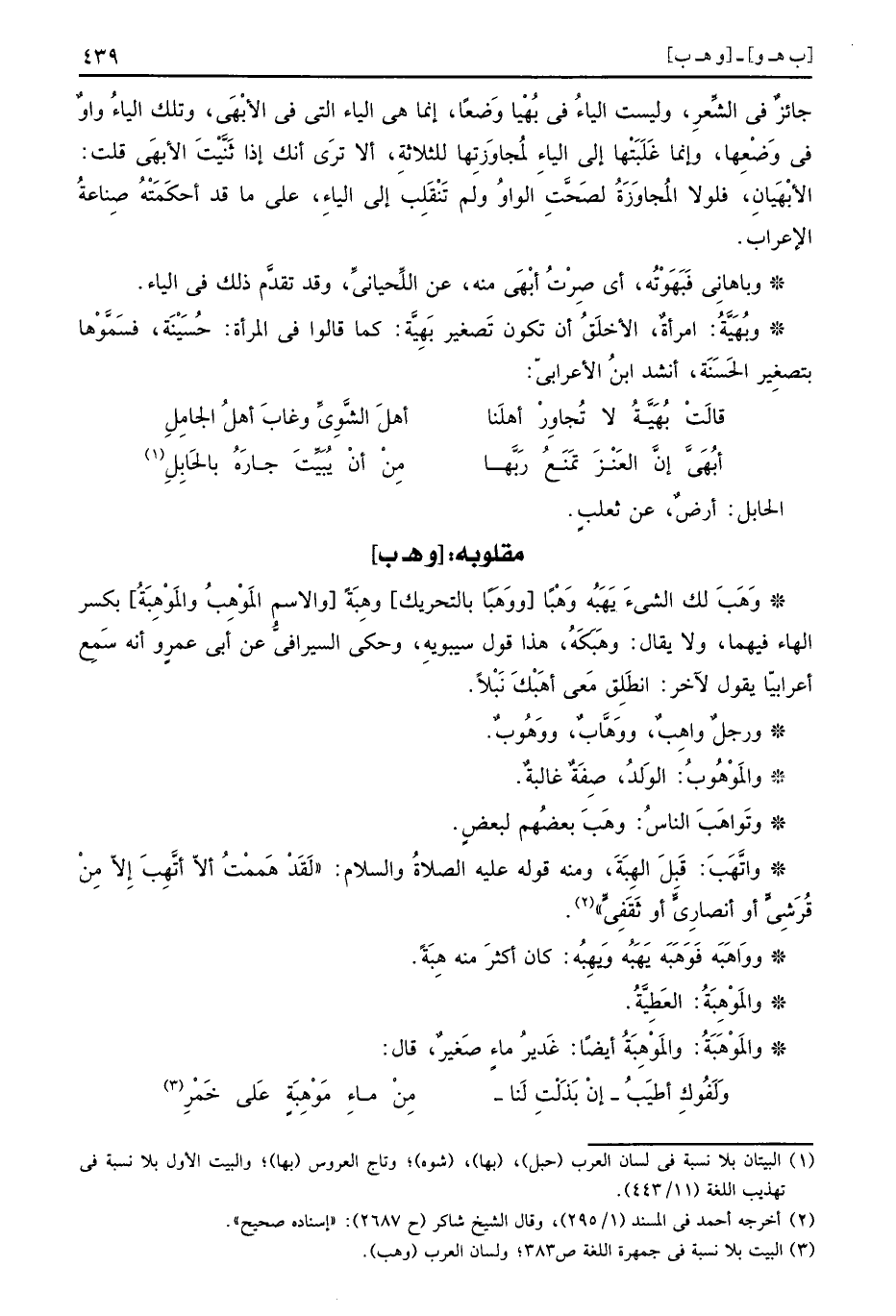 واتَّهَبَ: قبل الهِبَةَ، وَمِنْه قَوْله عَلَيْهِ الصَّلَاة وَالسَّلَام: " لقد هَمَمْت أَلا أتَّهِبَ إِلَّا من قُرَشِيٍّ أَو أنصارِيٍّ أَو ثقفي ".