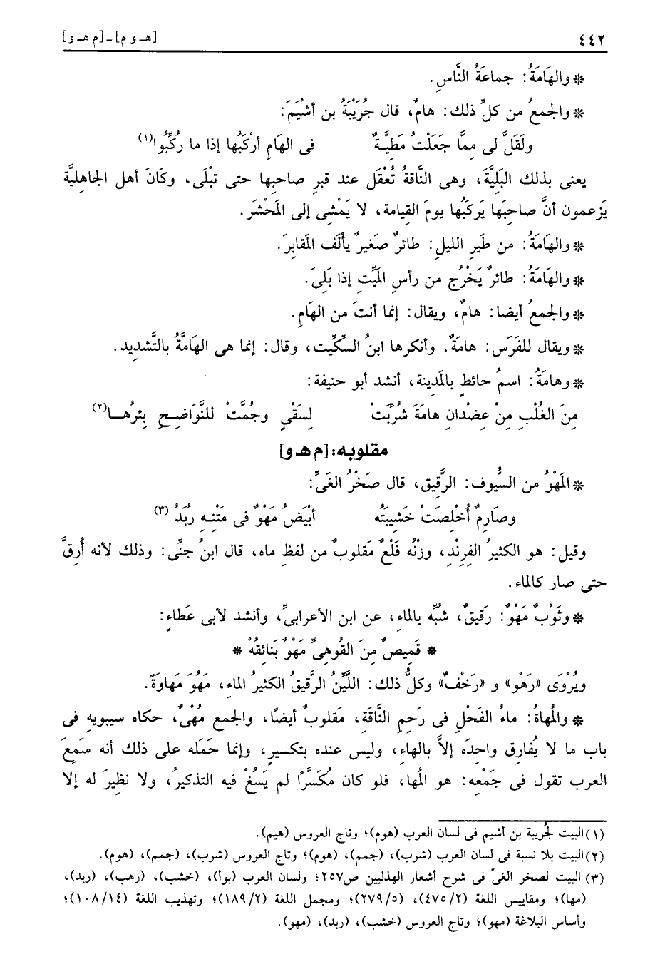 وَالْجمع من كل ذَلِك: هامٌ، قَالَ جريبة ابْن أَشْيَم: