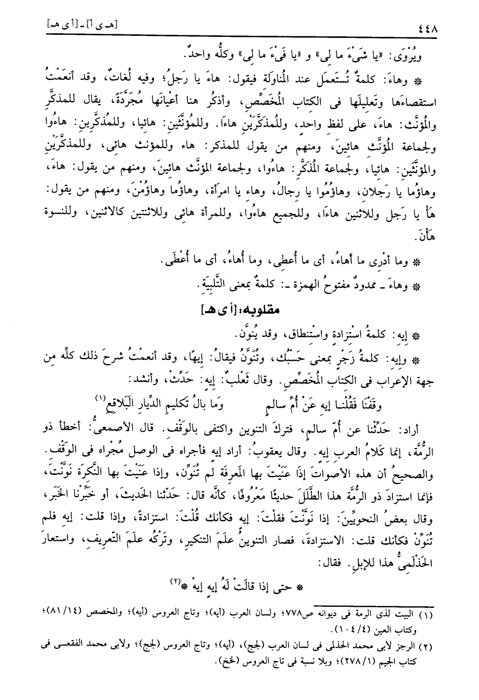 أَرَادَ: حَدثنَا عَن أم سَالم، فَترك التَّنْوِين وَاكْتفى بِالْوَقْفِ. قَالَ الْأَصْمَعِي: اخطأ ذُو الرمة، إِنَّمَا كَلَام الْعَرَب إيه. وَقَالَ يَعْقُوب: أَرَادَ إيه فأجراه فِي الْوَصْل مجْرَاه فِي الْوَقْف. وَالصَّحِيح أَن هَذِه الْأَصْوَات إِذا عنيت بهَا الْمعرفَة لم تنون، وَإِذا عنيت بهَا النكرَة نونت، فَإِنَّمَا اسْتَزَادَ ذُو الرمة هَذَا الطلل حَدِيثا مَعْرُوفا، كَأَنَّهُ قَالَ: حَدثنَا الحَدِيث، أَو خبرنَا الْخَبَر، وَقَالَ بعض النَّحْوِيين: إِذا نونت فَقلت: إيه فكأنك قلت: استزادة، وَإِذا قلت: إيه فَلم تنون فكأنك قلت الاستزادة، فَصَارَ التَّنْوِين علم التنكير، وَتَركه علم التَّعْرِيف، واستعار الحذلمي هَذَا لِلْإِبِلِ، فَقَالَ: