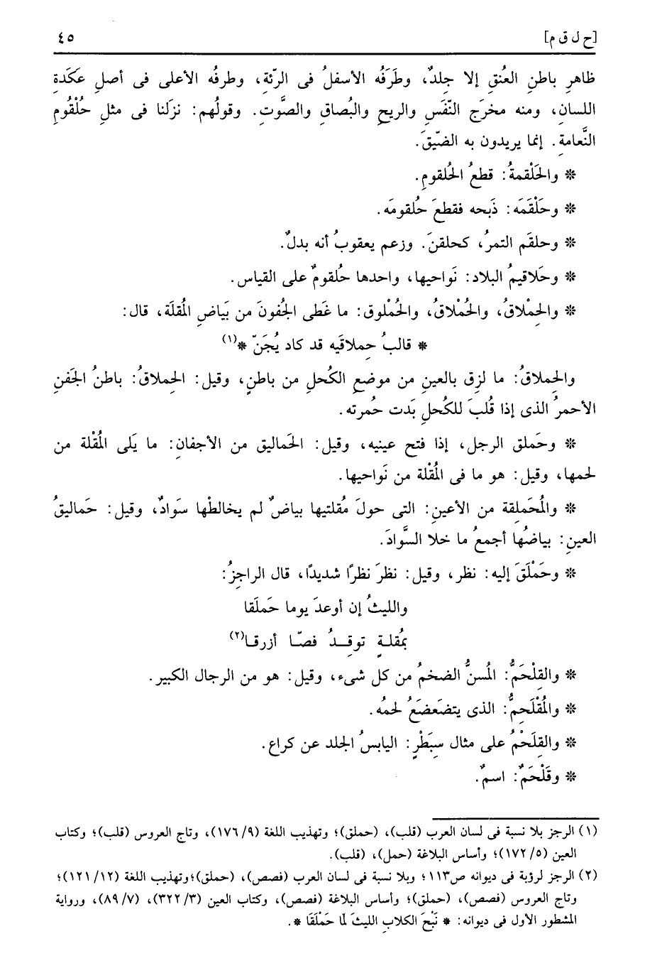 وحَلاقيمُ الْبِلَاد: نَوَاحِيهَا، وَاحِدهَا حلقوم على الْقيَاس.