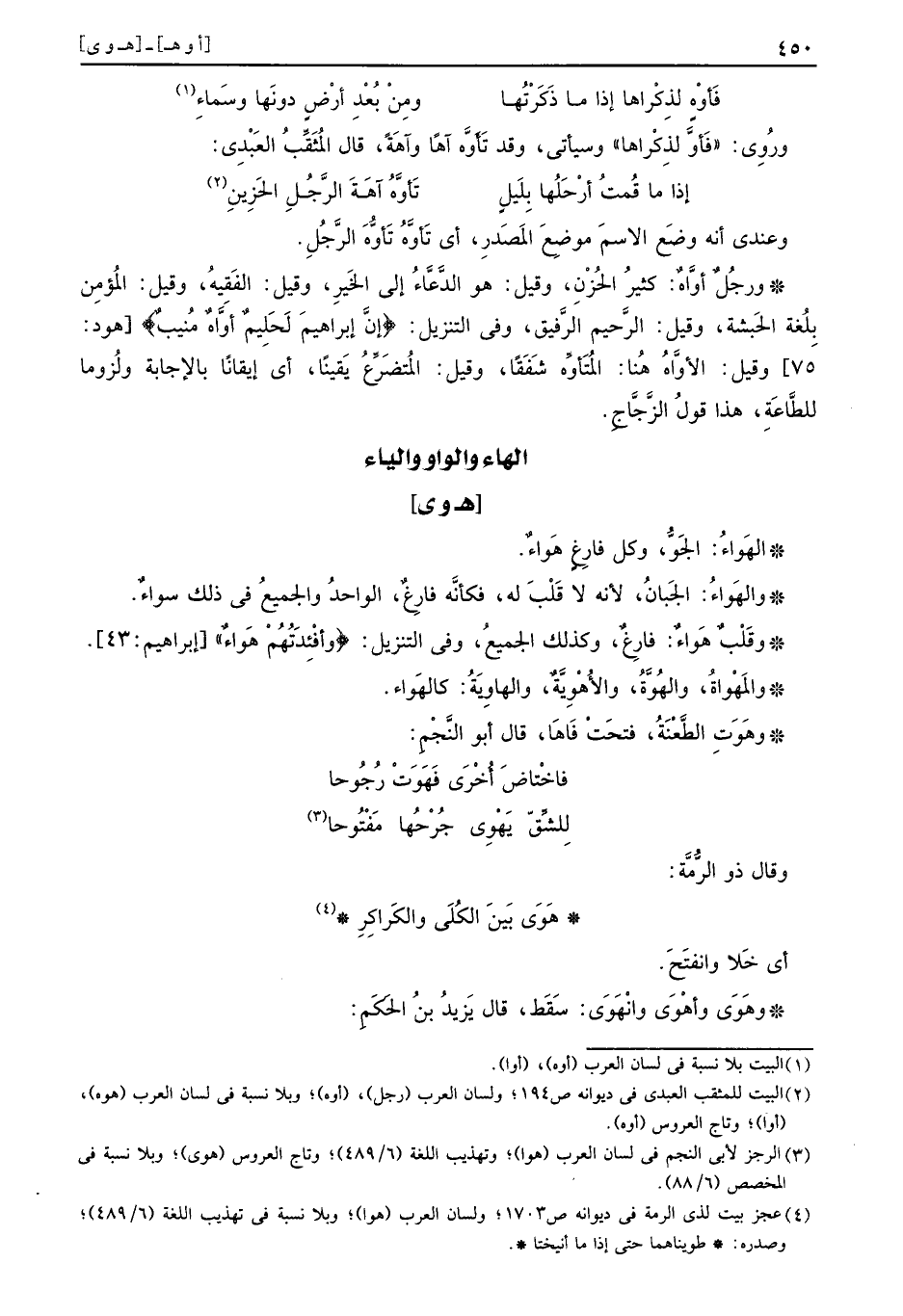 وَرجل أوَّاهٌ: كثير الْحزن، وَقيل: هُوَ الدُّعَاء إِلَى الْخَيْر، وَقيل: الْفَقِيه، وَقيل: الْمُؤمن بلغَة الْحَبَشَة، وَقيل: الرَّحِيم الرفيق، وَفِي التَّنْزِيل: (إنَّ إِبْرَاهِيم لَحَلِيمٌ أوَّاهٌ مُنيبٌ) وَقيل: الأوَّاهُ هُنَا: المُتَأوِّه شفقا، وَقيل: المتضرع يَقِينا، أَي إيقاناً بالإجابة ولزوما للطاعة، هَذَا قَول الزّجاج.