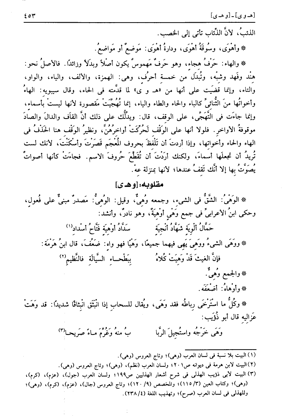 وَالْهَاء: حرف هجاء، وَهُوَ حرف مهموس يكون أصلا وبدلا وزائدا، فالاصل نَحْو: هِنْد وفهد وَشبه، وتبدل من خَمْسَة أحرف، وَهِي: الْهمزَة، والالف، وَالْيَاء، وَالْوَاو، وَالتَّاء، وَإِنَّمَا قضيت على إِنَّهَا من " هـ وى " لما قَدمته فِي الْحَاء، وَقَالَ سِيبَوَيْهٍ: الْهَاء وَأَخَوَاتهَا من الثنائي كالباء والحاء والطاء وَالْيَاء، إِنَّمَا تهجيت مَقْصُورَة لِأَنَّهَا لَيست باسماء، وَإِنَّمَا جَاءَت فِي التهجي، على الْوَقْف، قَالَ: ويدلك على ذَلِك أَن الْقَاف وَالدَّال وَالصَّاد مَوْقُوفَة الاواخر، فَلَولَا إِنَّهَا على الْوَقْف لحركت اواخرهن، وَنَظِير الْوَقْف هُنَا الْحَذف فِي الْهَاء والحاء وَأَخَوَاتهَا، وَإِذا أردْت أَن تلفظ بحروف المعجم قصرت واسكنت، لِأَنَّك لست تُرِيدُ أَن تجعلها أَسمَاء، وَلَكِنَّك أردْت أَن تقطع حُرُوف الِاسْم، فَجَاءَت كَأَنَّهَا أصوات يصوت بهَا إِلَّا انك تقف عِنْدهَا، لِأَنَّهَا بِمَنْزِلَة عه.