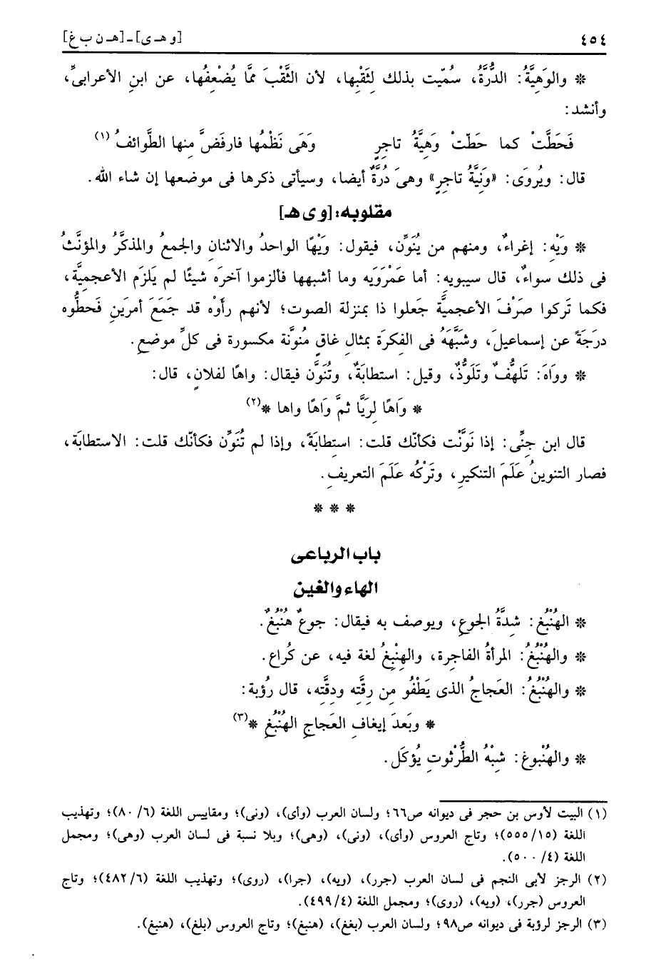 وَيْهِ: إغراء، وَمِنْهُم من ينون، فَيَقُول: وَيْهاً الْوَاحِد والاثنان وَالْجمع والمذكر والمؤنث فِي ذَلِك سَوَاء، قَالَ سِيبَوَيْهٍ: أما عمرويه وَمَا أشبههَا فألزموا آخِره شَيْئا لم يلْزم الأعجمية، فَكَمَا تركُوا صرف الأعجمية جعلُوا ذَا بِمَنْزِلَة الصَّوْت، لأَنهم رَأَوْهُ قد جمع أَمريْن فحطوه دَرَجَة عَن إِسْمَاعِيل، وَشبهه فِي الفكرة بمثال غاق منونة مَكْسُورَة فِي كل مَوضِع.